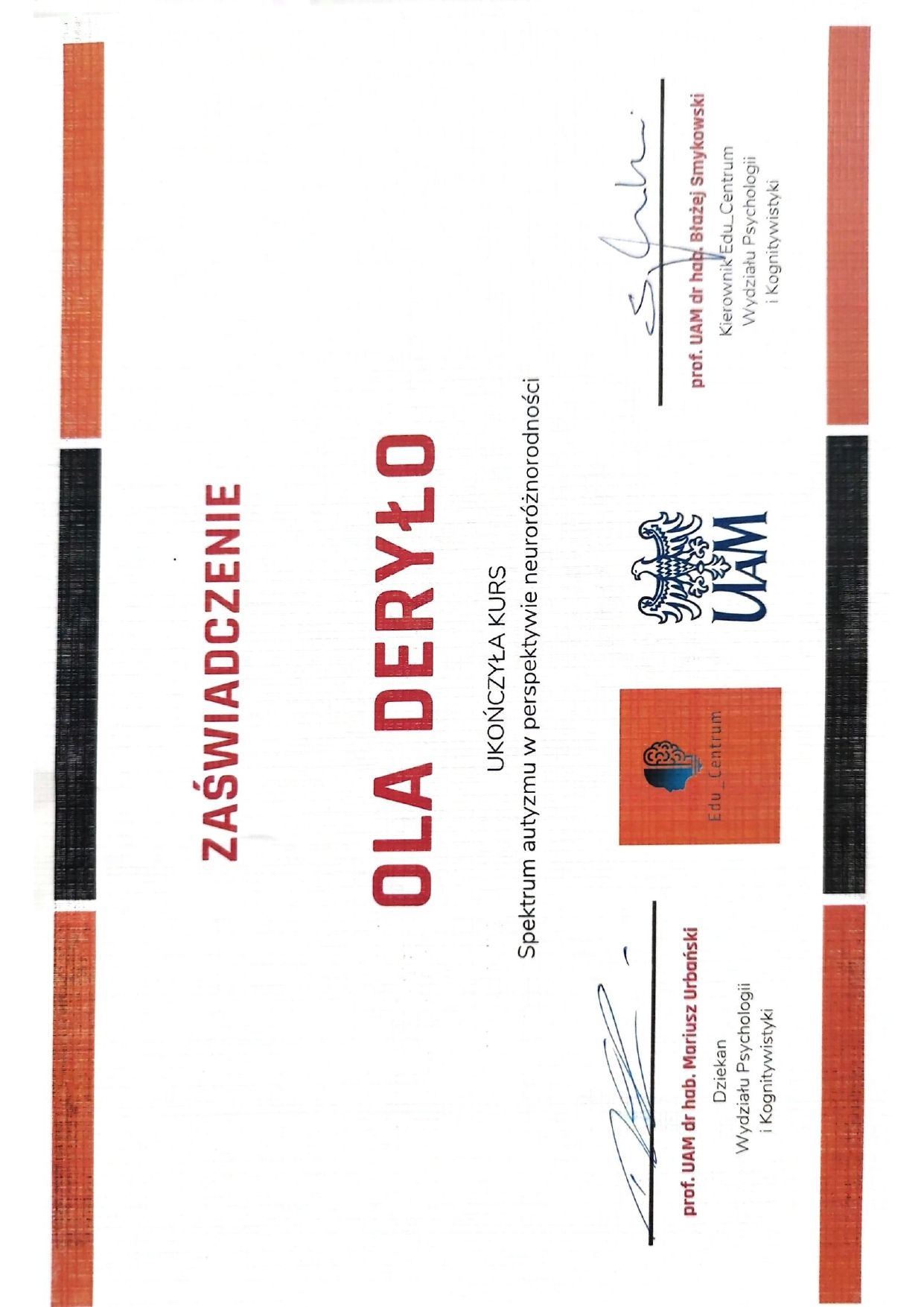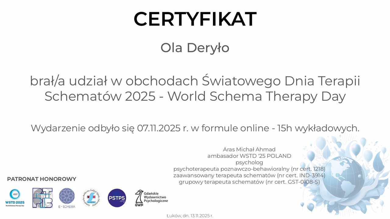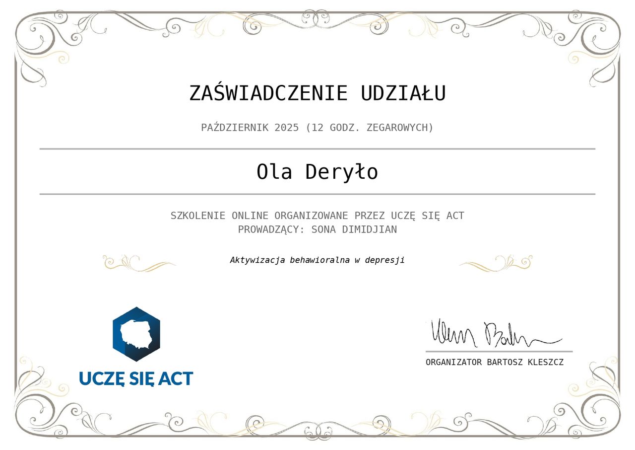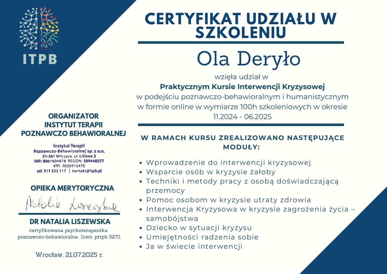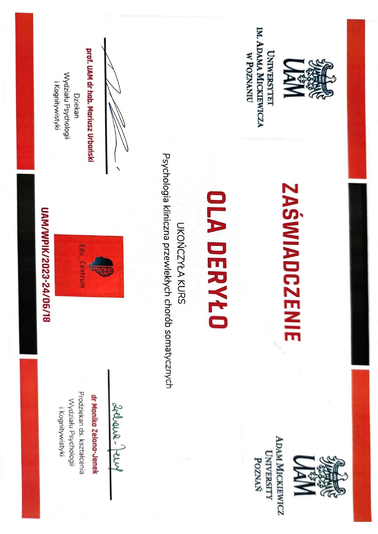 Jestem psychologiem w trakcie dalszego kształcenia i intensywnego rozwoju zawodowego w obszarze zdrowia psychicznego. Ukończyłam studia magisterskie z psychologii na Uniwersytecie im. Adama Mickiewicza w Poznaniu, roczny kurs interwencji kryzysowej w Instytucie ITPB i wiele innych szkoleń. Od października 2025 r. rozpoczęłam studia podyplomowe „Psychosomatyka i somatopsychologia” na Uniwersytecie SWPS.