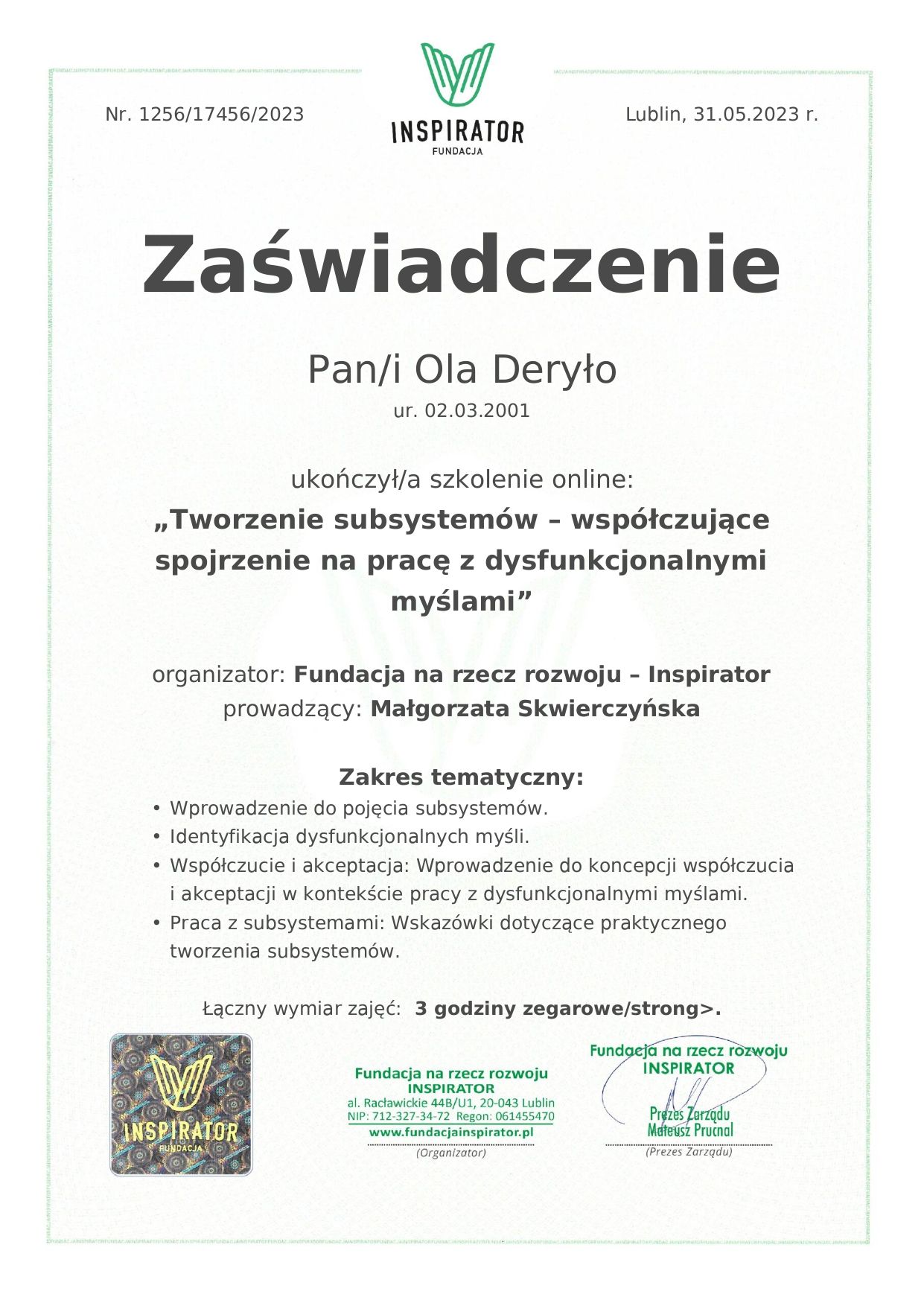 Jaki jest zakres porad oferowanych przez Ola Deryło?Ola Deryło to psycholog. Na podstawie swojego doświadczenia i wykształcenia Ola Deryło oferuje usługi takie jak: Konsultacja psychologiczna, konsultacja psychologiczna (weekend), Konsultacja psychologiczna online.