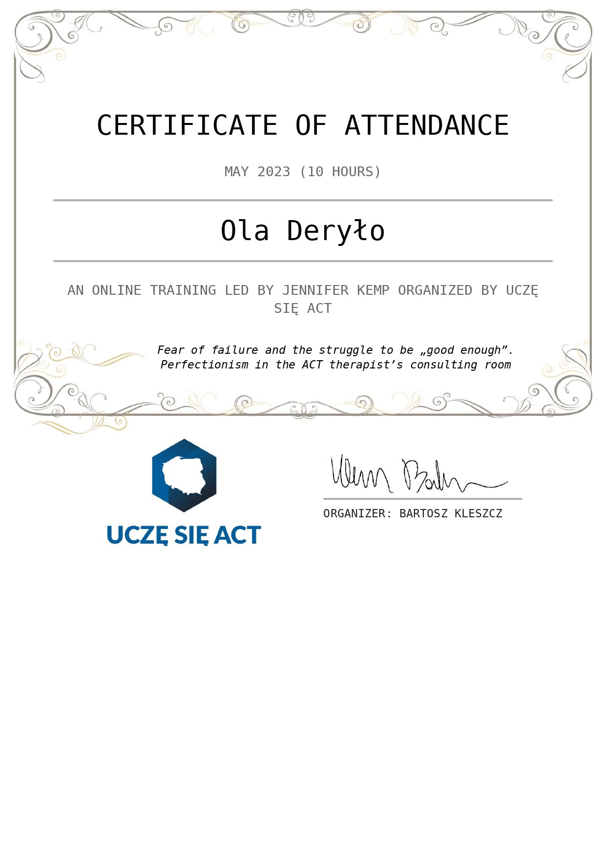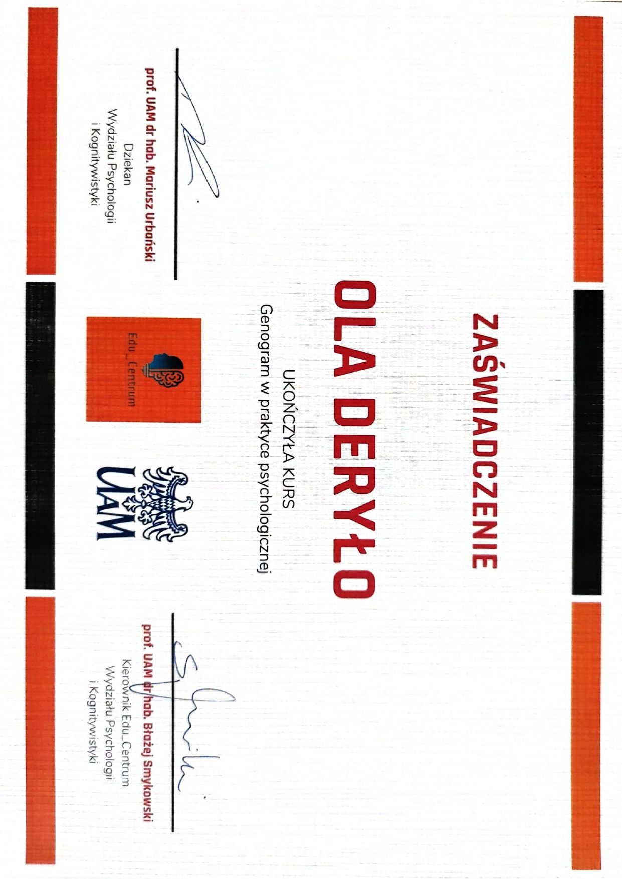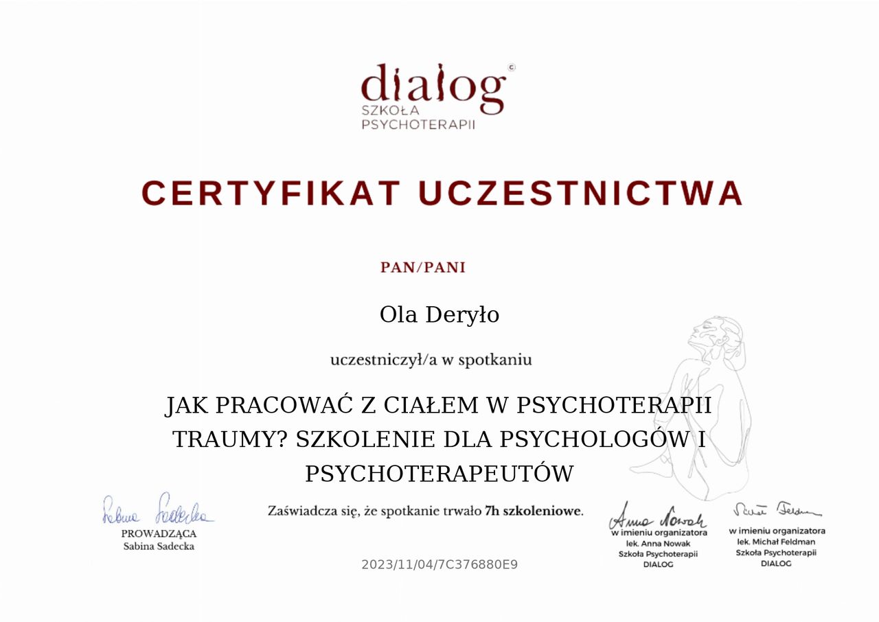 Pracę wykonuję zgodnie z Kodeksem Etyki Zawodu Psychologa oraz poddaję regularnej superwizji.