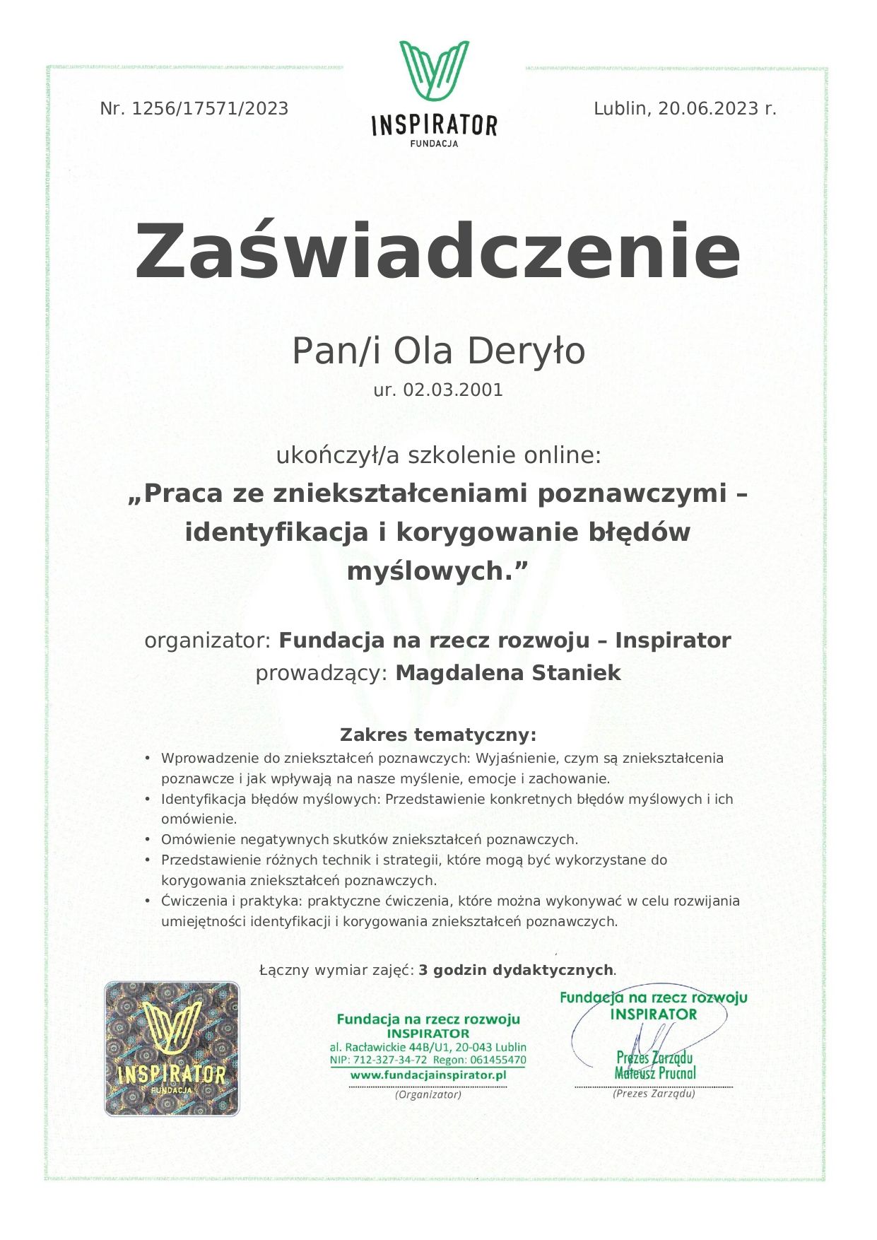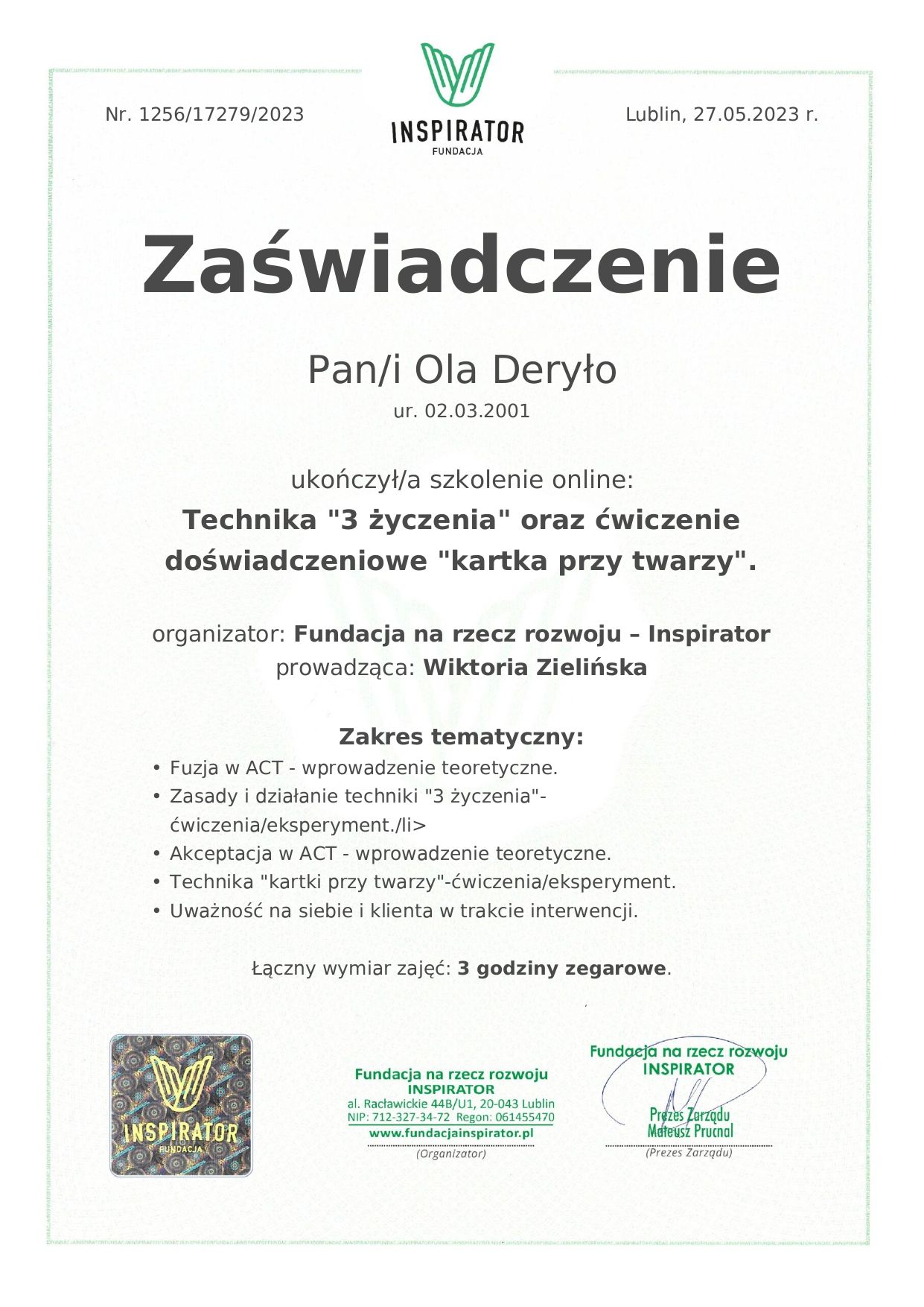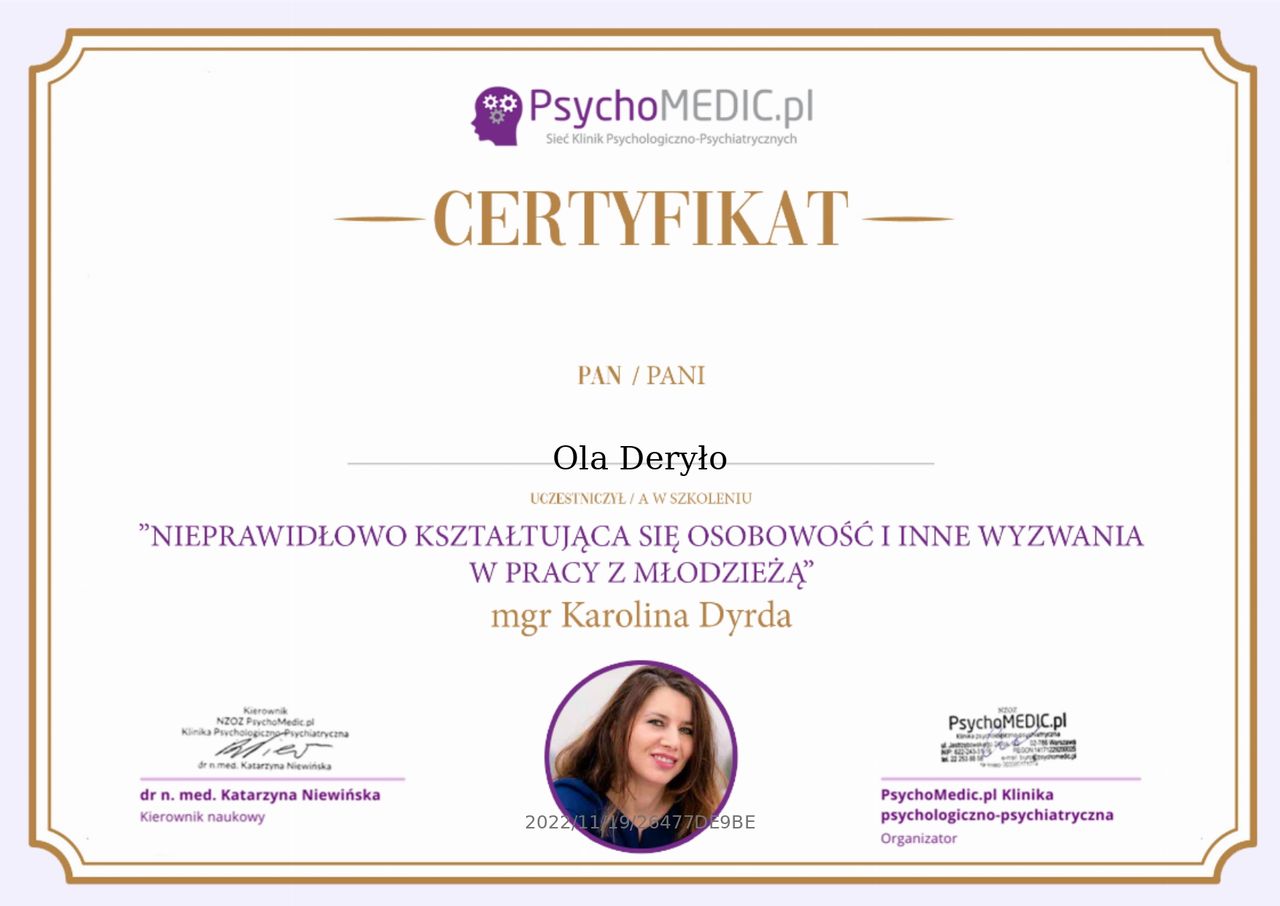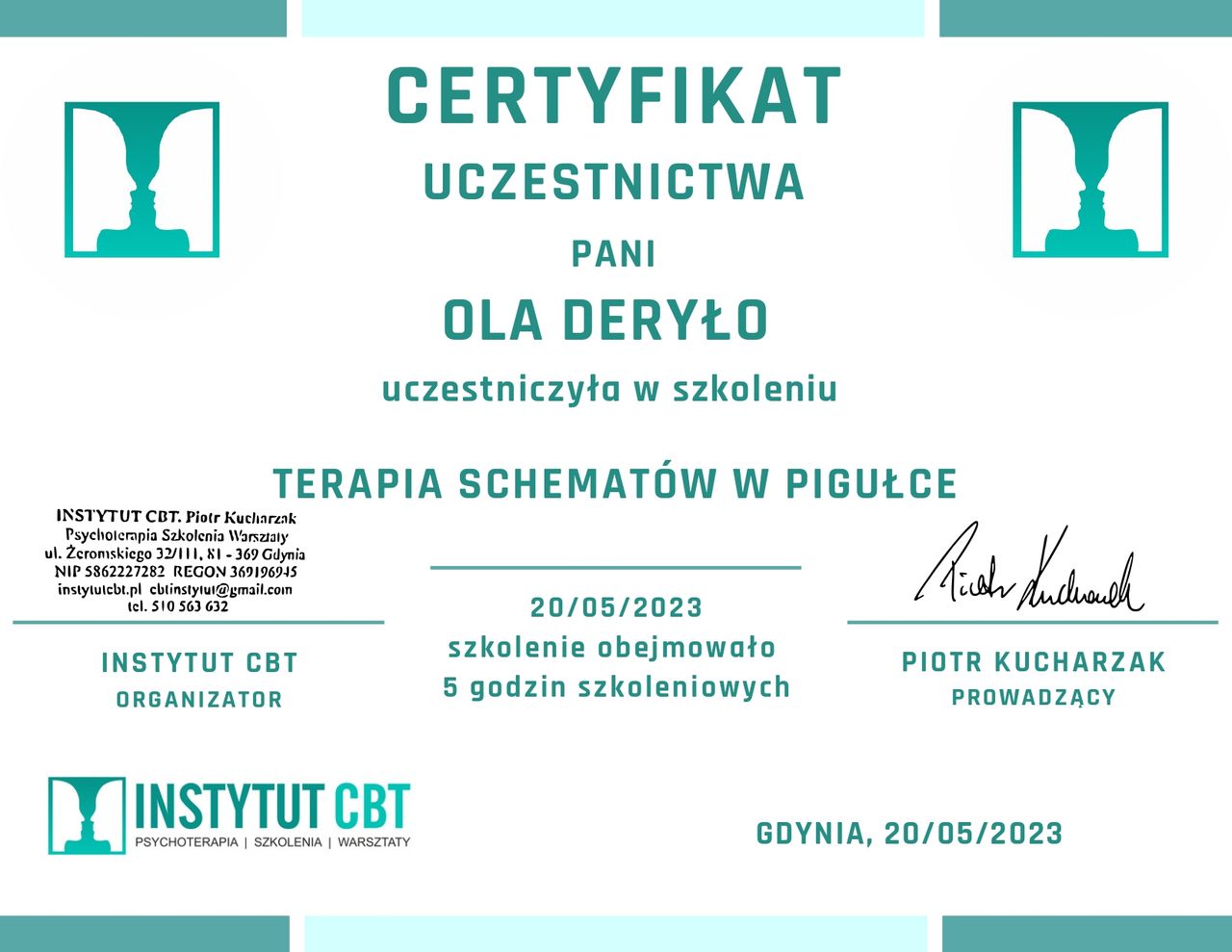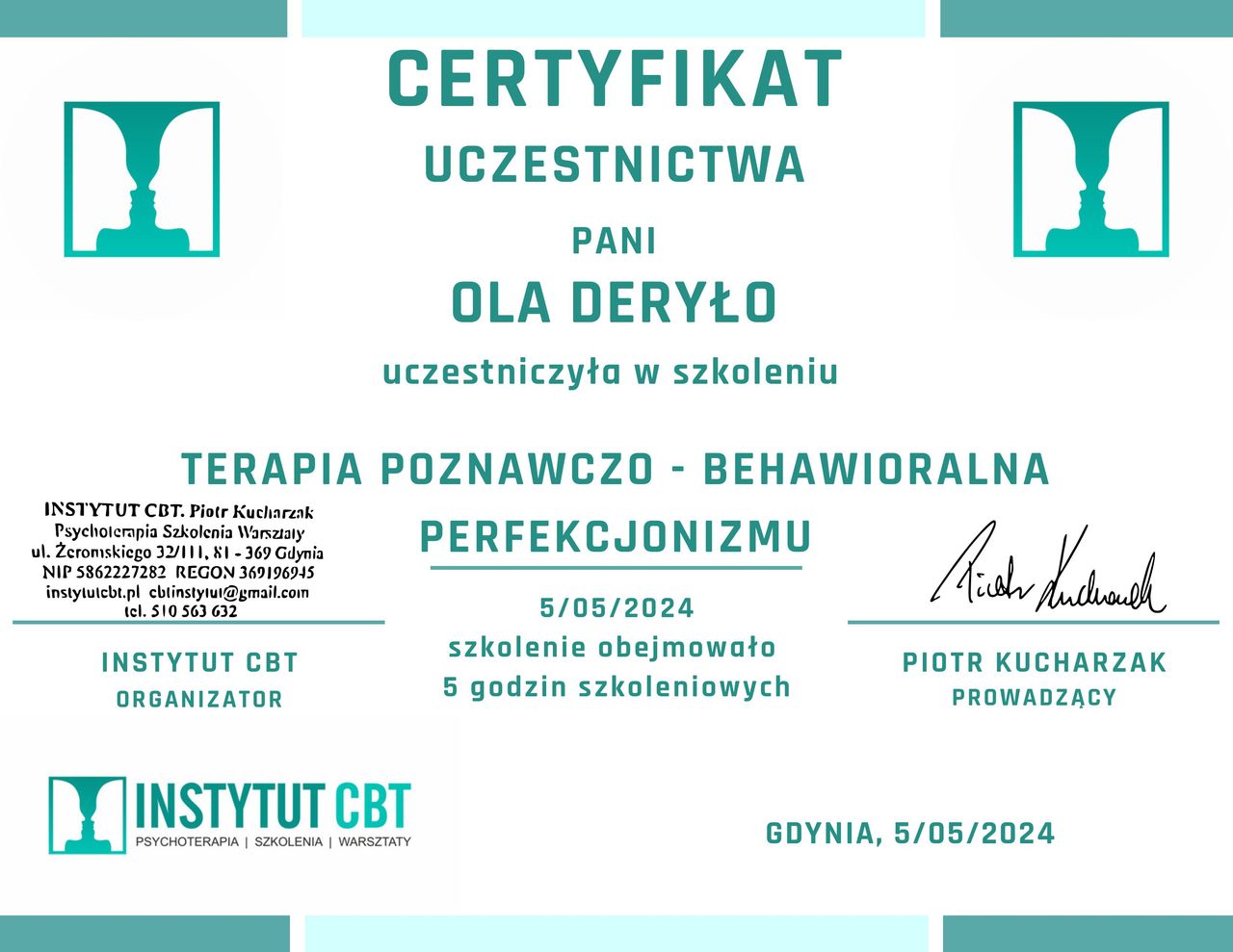 Czy Ola Deryło przyjmuje online, bez konieczności pojawiania się w placówce?Tak, Ola Deryło oferuje konsultacje online. Wybierz opcję „konsultacja online” przy umawianiu wizyty, a zobaczysz dostępne terminy.
