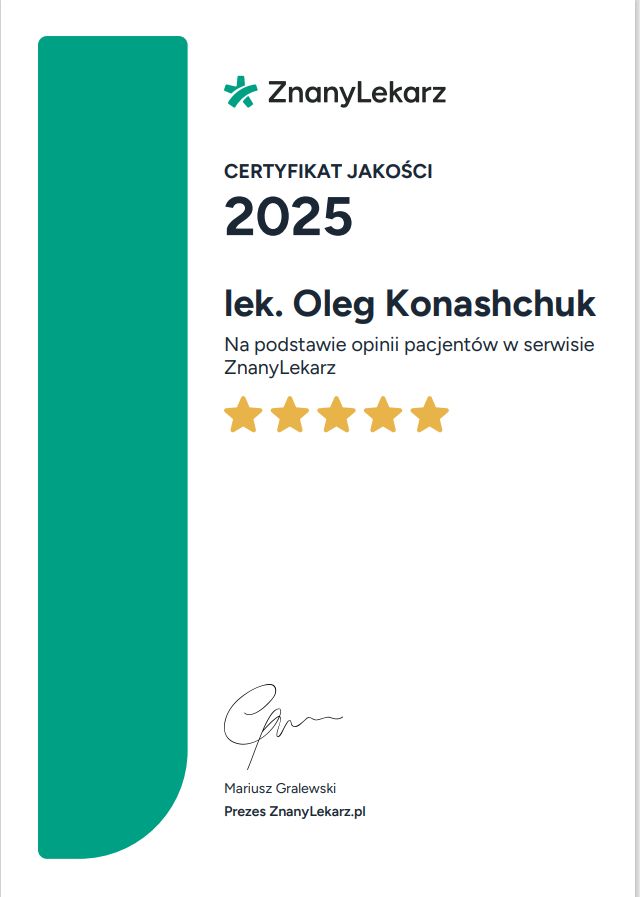 Doktor Konashchuk to bardzo miły i kompetentny lekarz. Wysłucha uważnie pacjenta, wyjaśni problemy oraz jak będzie przebiegać leczenie. Poświęca pacjentowi wystarczającą ilość czasu. jest sympatycznym człowiekiem, przy którym człowiek nie wstydzi się swoich problemów. Polecam gorąco.