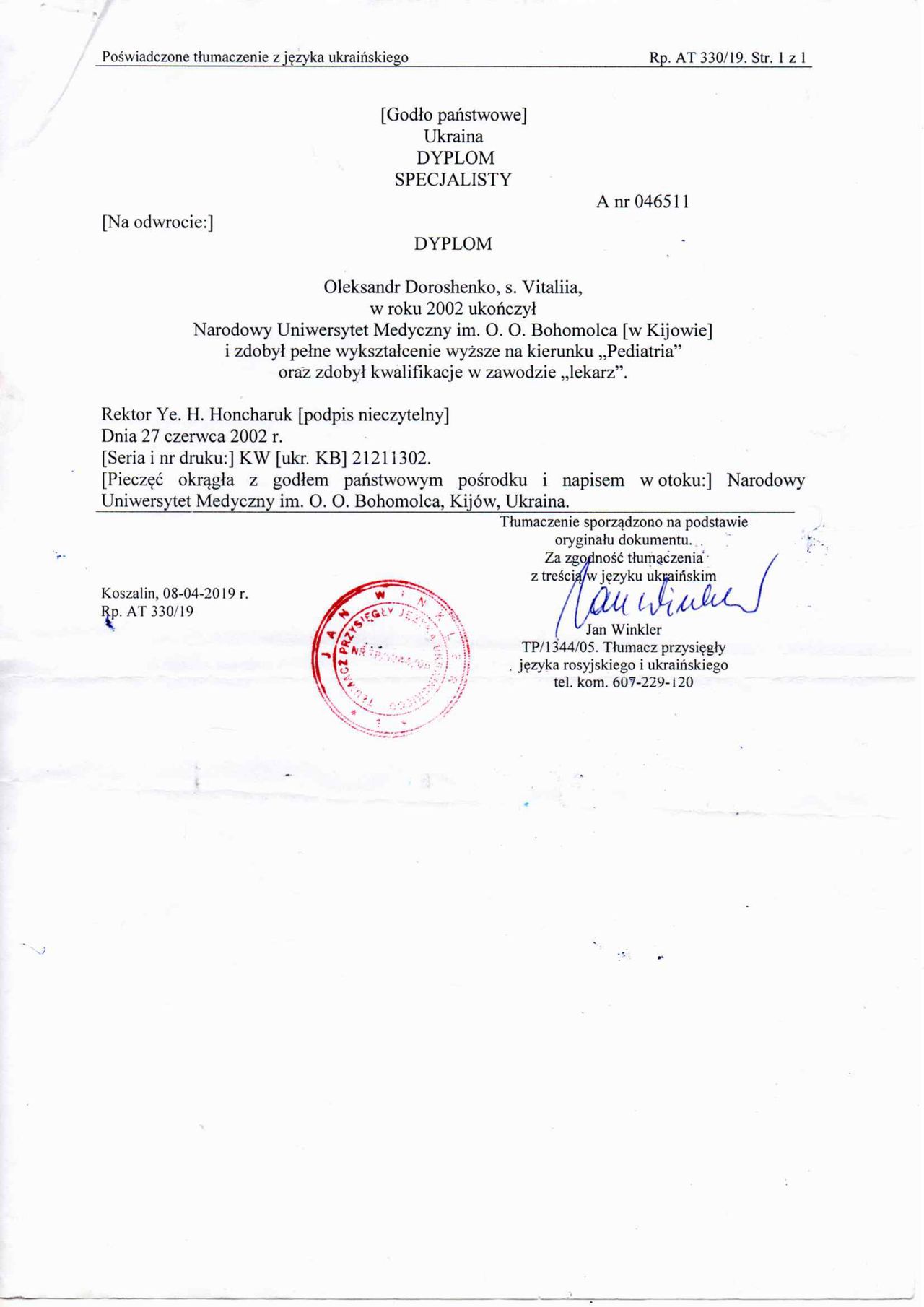 Jestem lekarzem posiadającym tytuł w dziedinie okulistyki i okulistyki dziecięcei zgodnie terminologji i zasadami obowiazującymi w systemie kształcenia w Ukrainie.