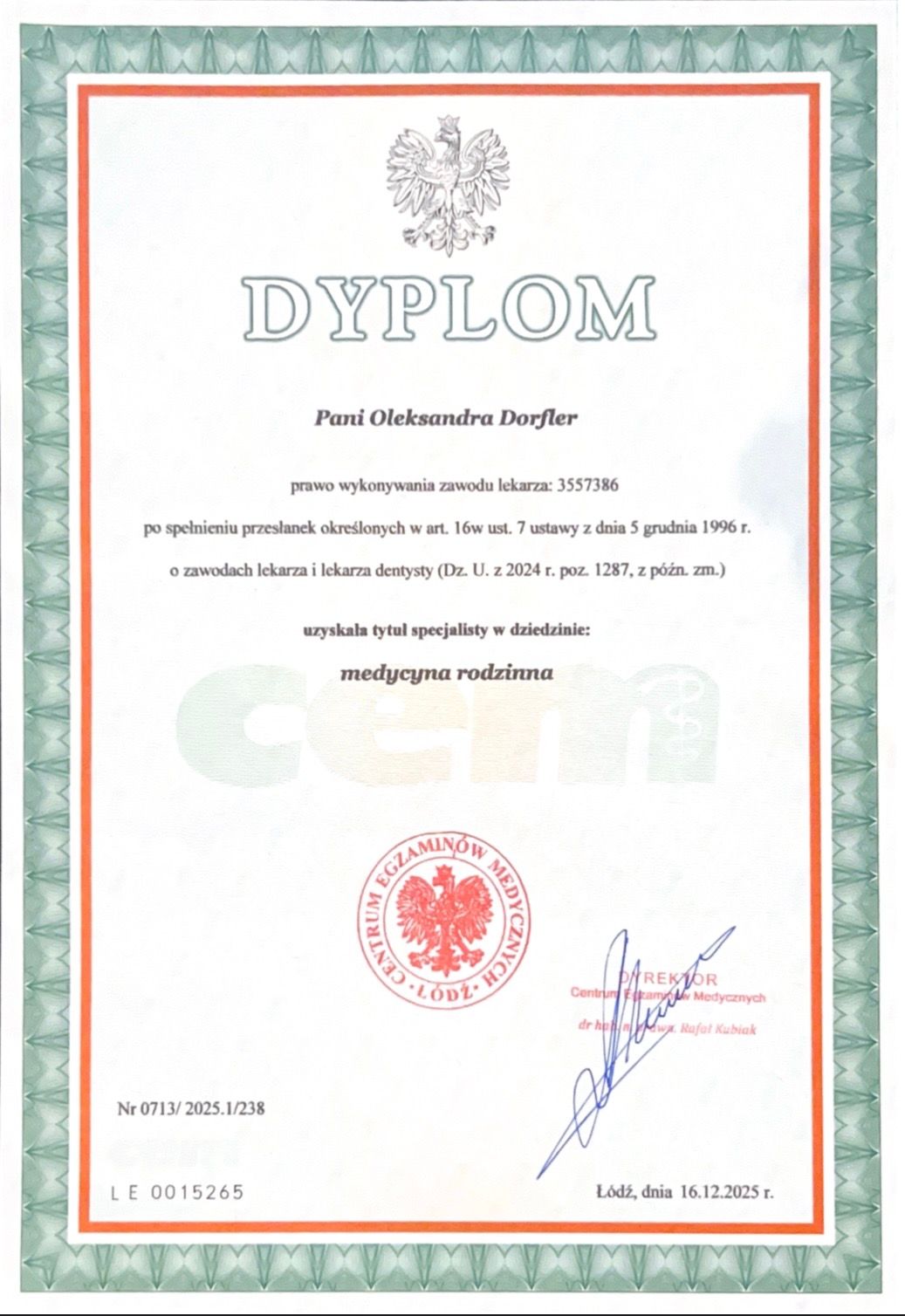 Sz.p. Olekasandra Dorfler to najlepszy lekarz jakiego kiedykolwiek w życiu poznałem , wszyscy inni lekarze powinni brać przykład z zaangażowania pani Oleksandry .