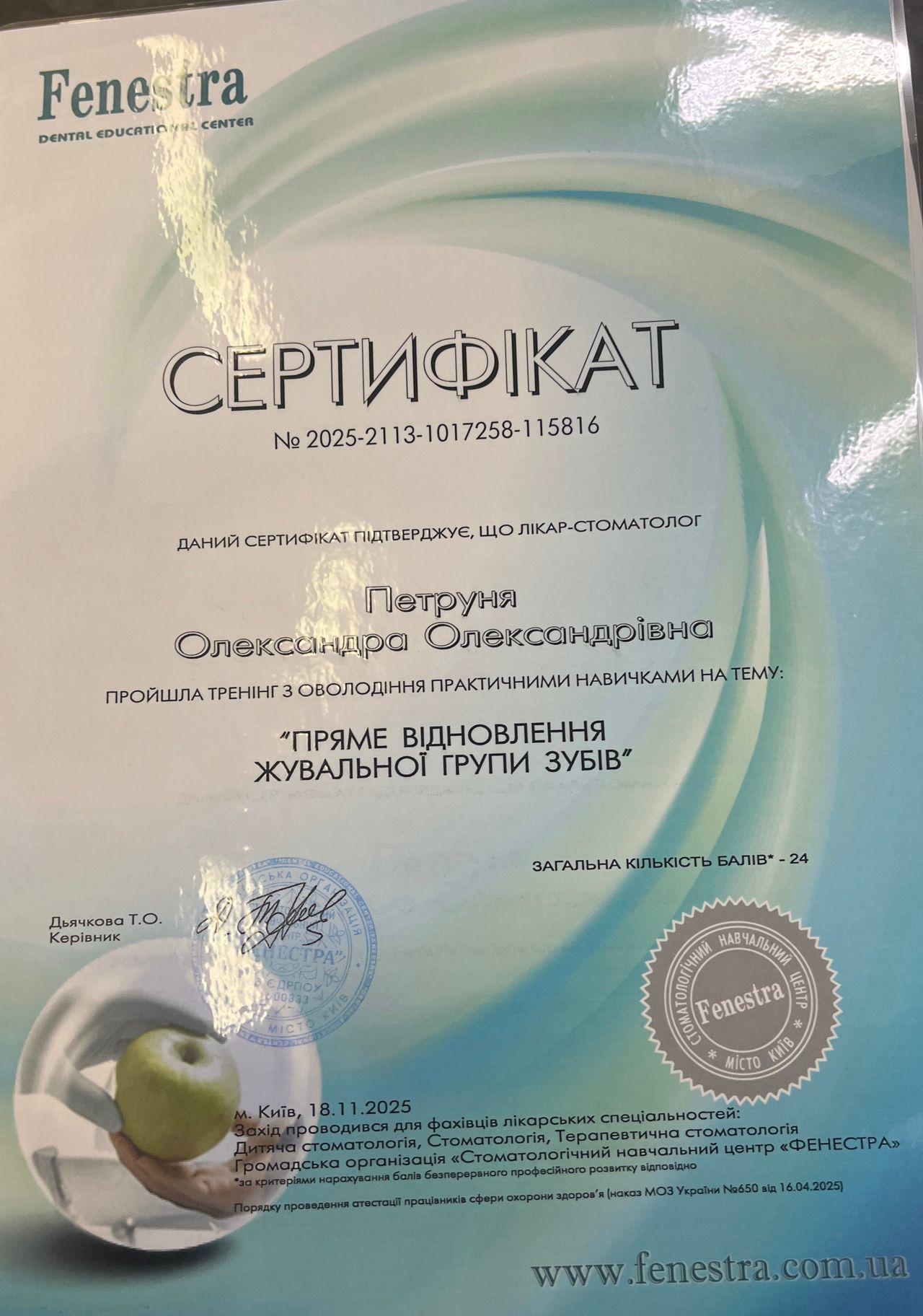 Jestem lekarzem dentystą, absolwentką Uniwersytetu Medycznego w Połtawie.