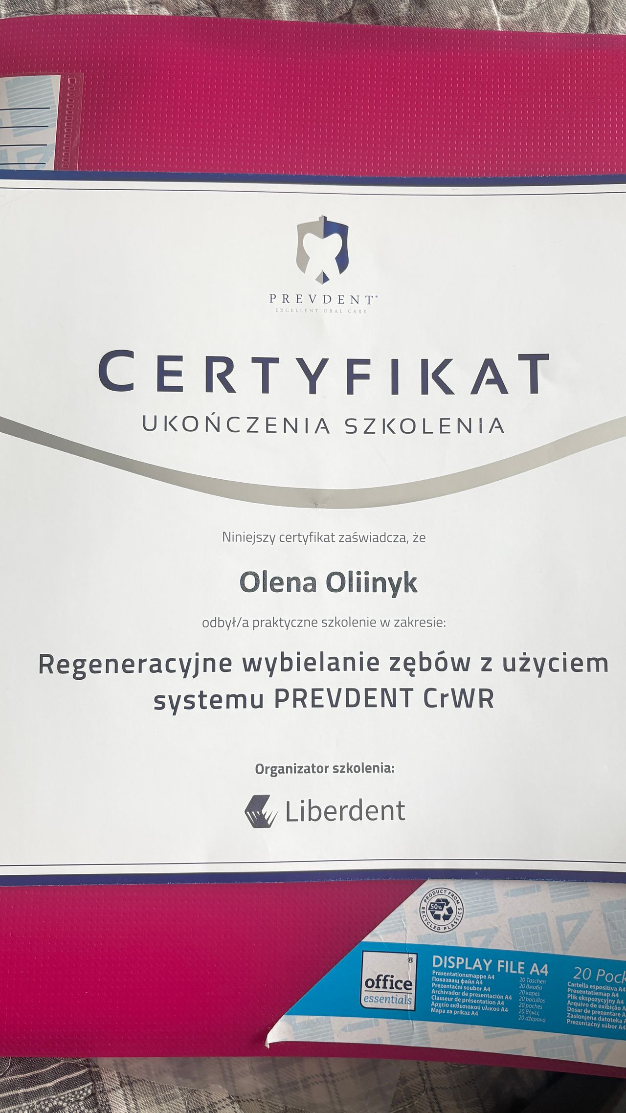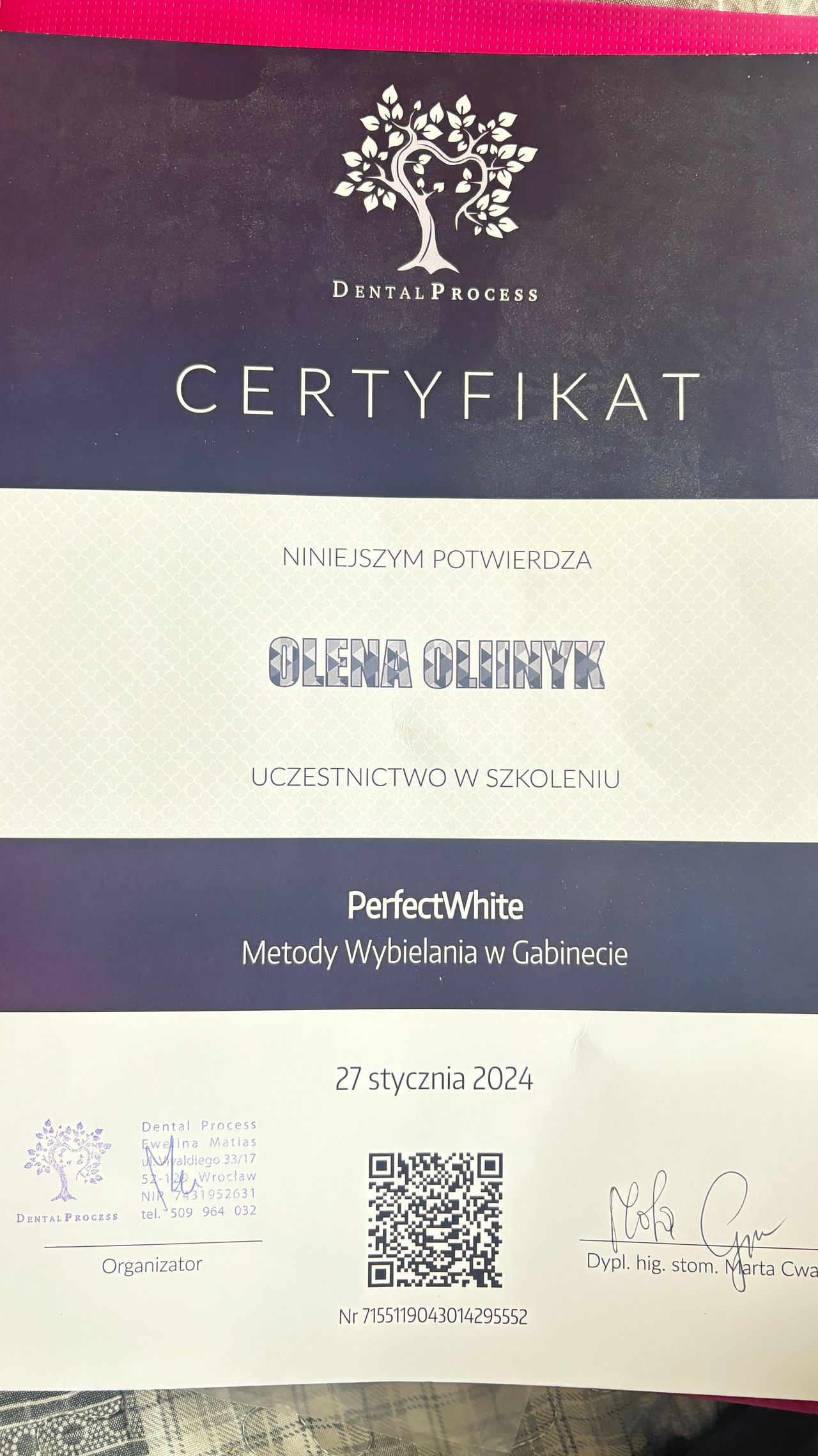 Jaki jest zakres porad oferowanych przez Olena Oliinyk ?Olena Oliinyk to higienistka/higienista stomatologiczny. Na podstawie swojego doświadczenia i wykształcenia Olena Oliinyk oferuje usługi takie jak: higienizacja, Wybielanie zębów, piaskowanie, usuwanie kamienia nazębnego, profilaktyka próchnicy, lakowanie zębów, fluoryzacja zębów, scaling + piaskowanie, Scaling + fluoryzacja, lakierowanie zębów.