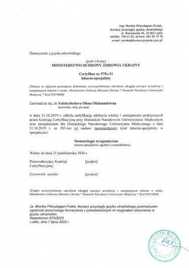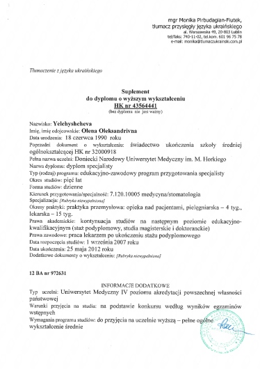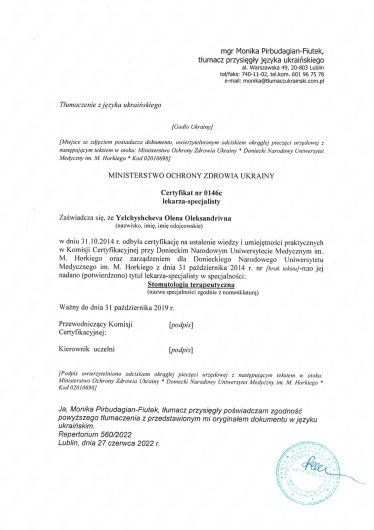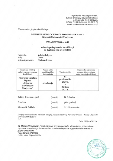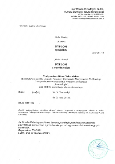 Mimo iż Pani Olena jest z Ukrainy poziom komunikacji w języku polskim jest darO dobry, plus też perfekcyjnie mówi po angielsku więc polecam dla wszystkich zagranicznych pacjentów.