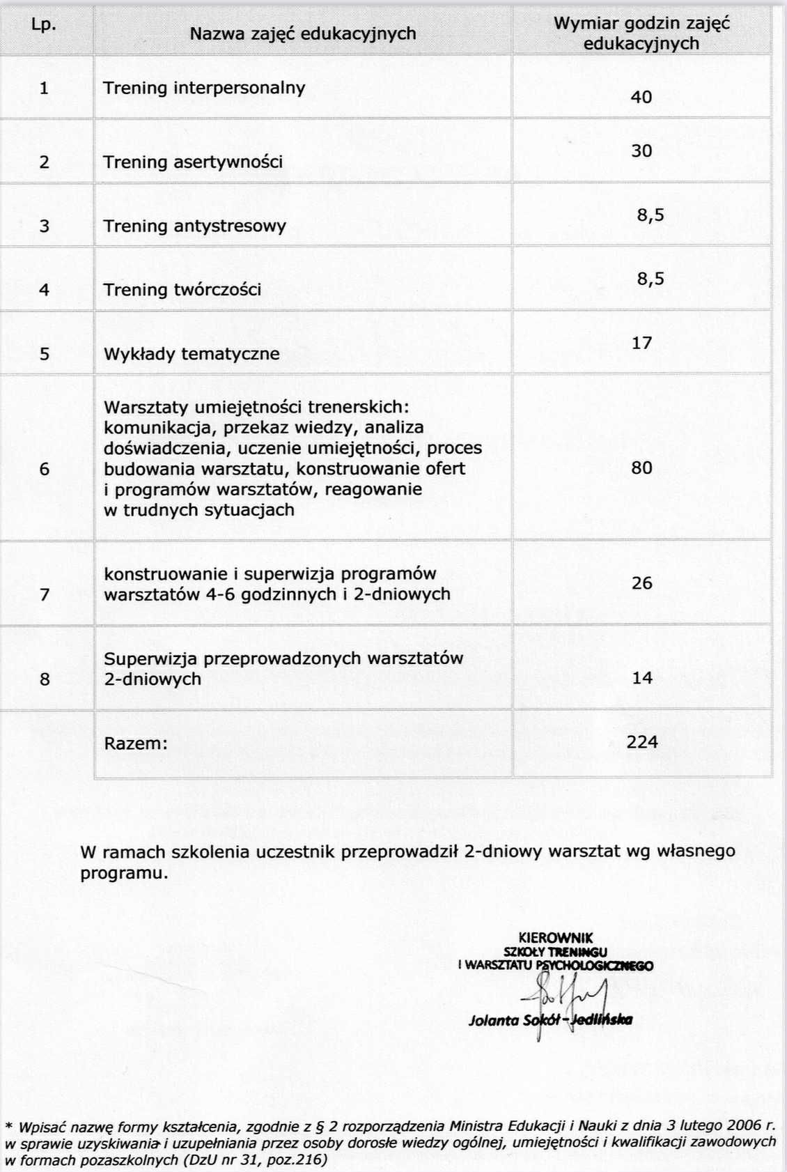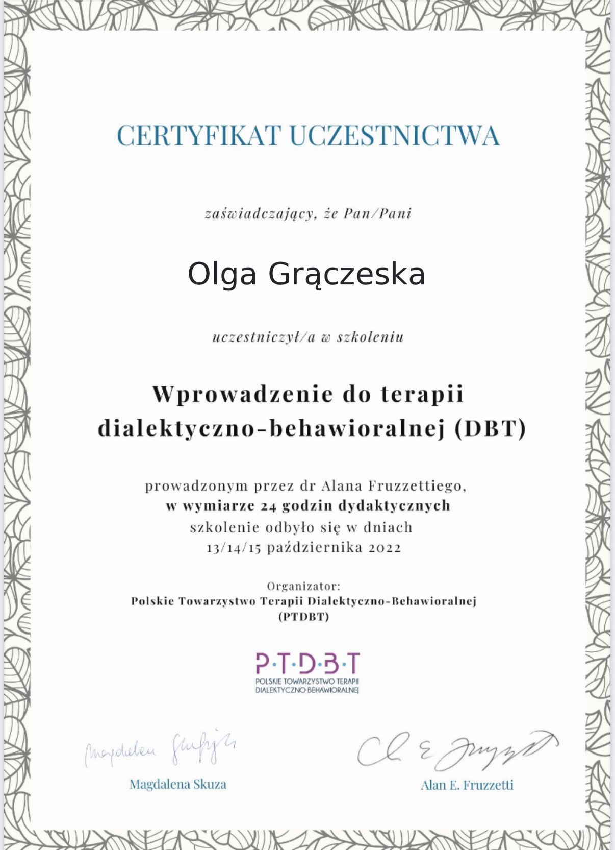 Jestem certyfikowaną psychoterapeutką poznawczo-behawioralną (CBT) (certyfikat PTTPB nr 742 od 2019 roku), certyfikowaną psychoterapeutką schematu (certyfikat ISST nr IND-4201 od 2025 roku), psycholożką oraz seksuolożką. Jestem członkinią European Association for Behavioural and Cognitive Therapies (EABCT) oraz International Society of Schema Therapy (ISST). Pracuję w języku polskim i angielskim.