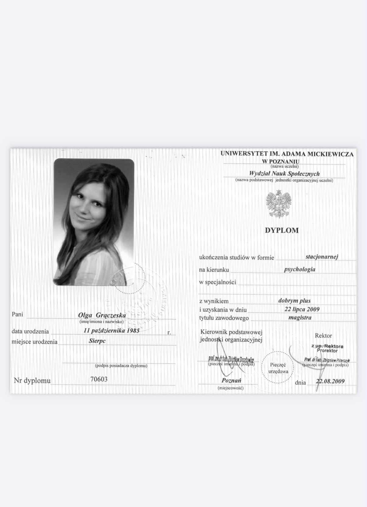 Shortly after moving to Poland I needed an English speaking psychotherapist. I was very afraid of being misunderstood and that I can be seen as strange or a bad person. It quickly became clear that I didn't need to be worried. Olga creates an atmosphere of warmth and calm. I know I can say anything without being judged or criticized. Olga can get my biggest problems of me. Not once tears come but there is a lot of relief. I'm very happy I found Olga. She's the best psychotherapist in my eyes.