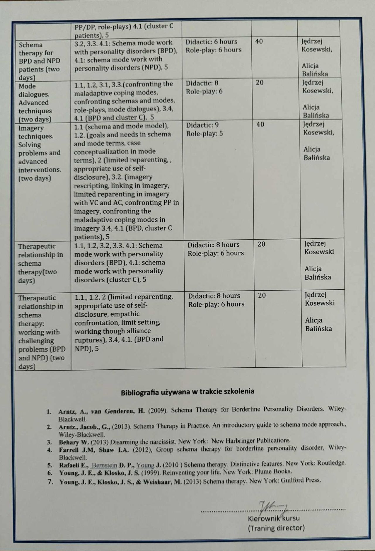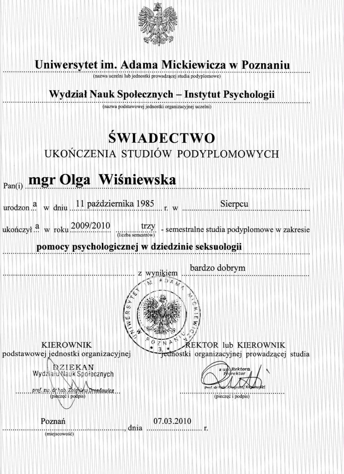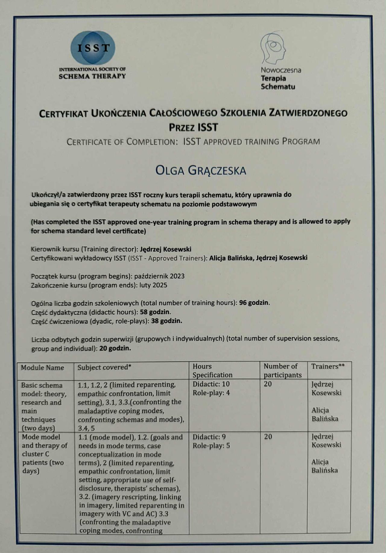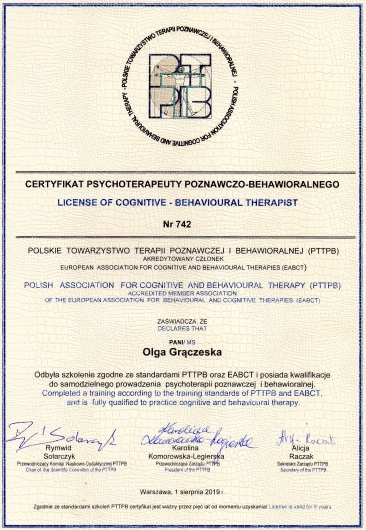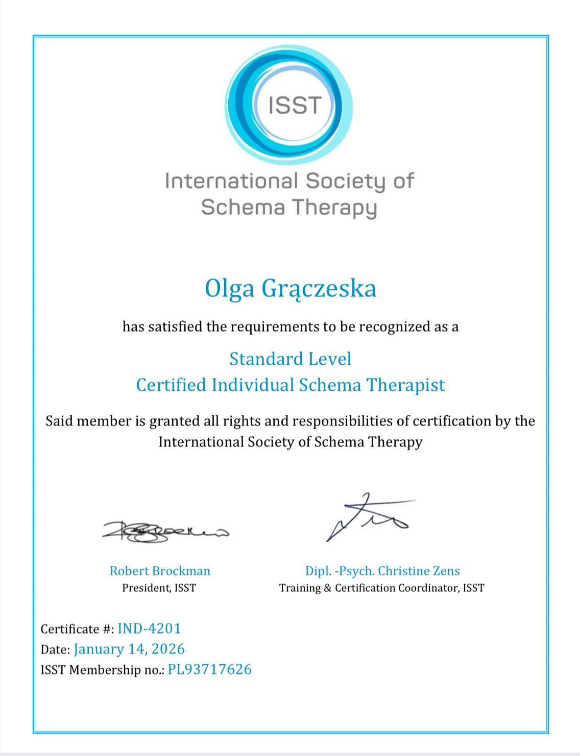 I am a certified Cognitive Behavioural Therapist (CBT) (certificate PTTPB No. 742 since 2019), a certified Schema Therapist (ISST certificate No. IND-4201 since 2025), psychologist and sexologist. I am a member of the European Association for Behavioural and Cognitive Therapies (EABCT) and the International Society of Schema Therapy (ISST). I work in both Polish and English.