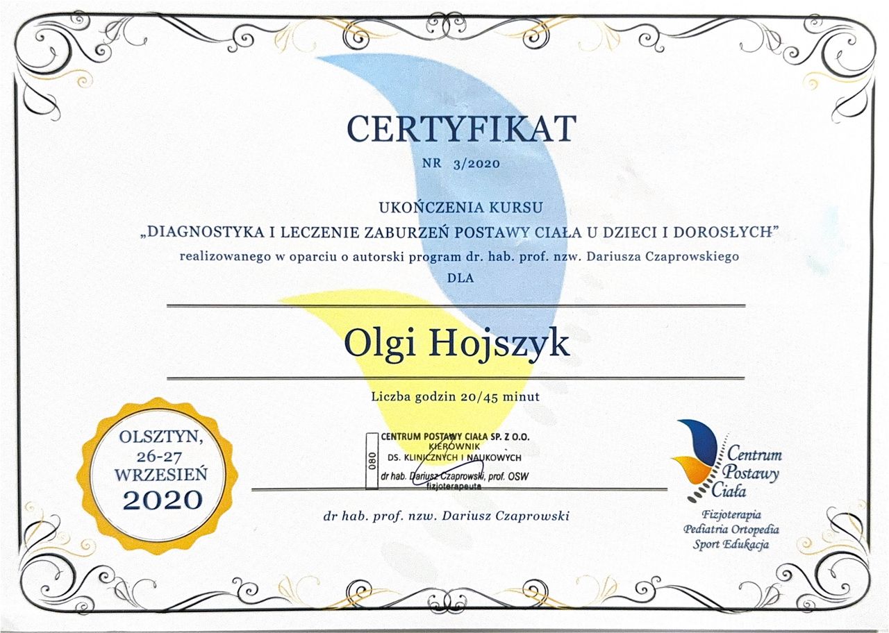 Jaki jest zakres porad oferowanych przez Olga Hojszyk?Olga Hojszyk to fizjoterapeuta. Na podstawie swojego doświadczenia i wykształcenia Olga Hojszyk oferuje usługi takie jak: ćwiczenia korekcyjne, badania diagnostyczne, badanie układu ruchu, badania kręgosłupa, taping (plastrowanie), fizjoterapia, Terapia manualna, terapia mięśniowo-powięziowa, konsultacja fizjoterapeutyczna dzieci, terapia przeciwbólowa.