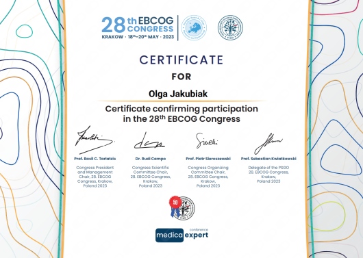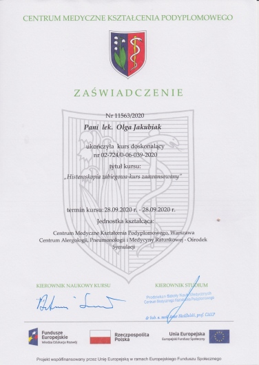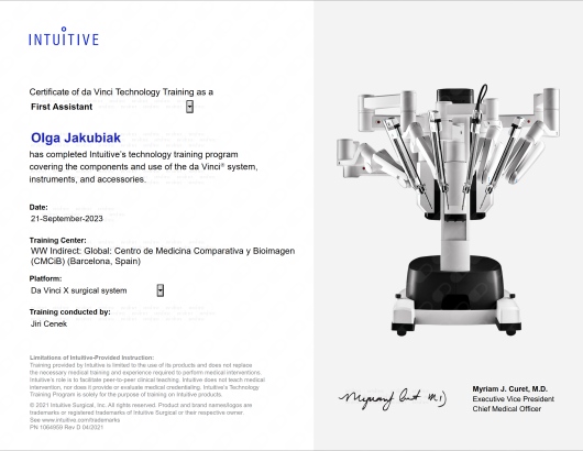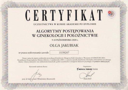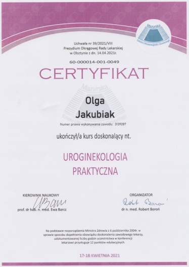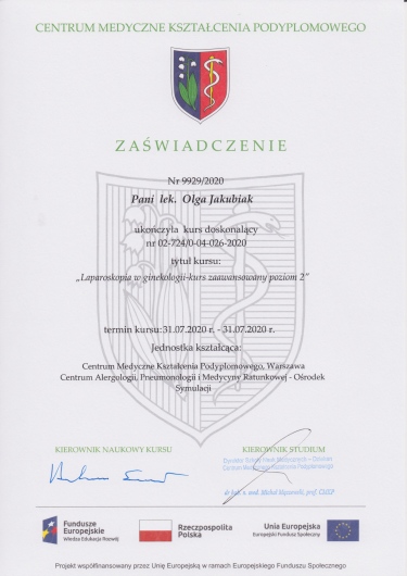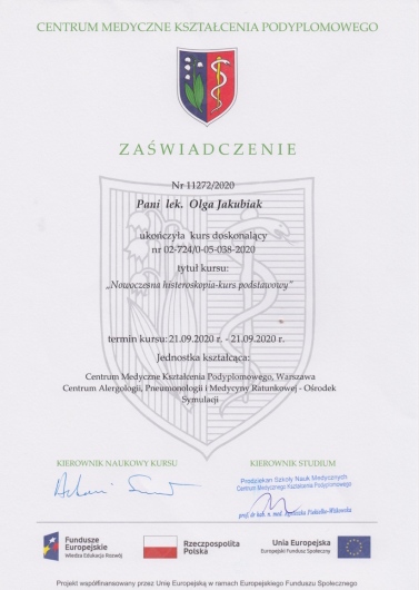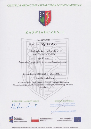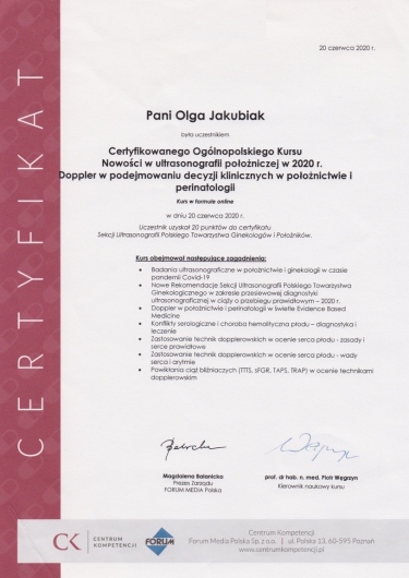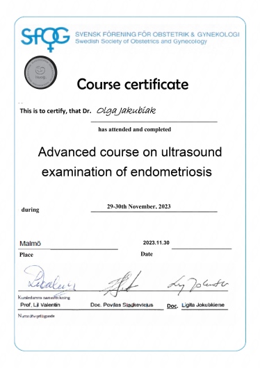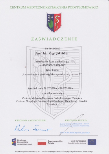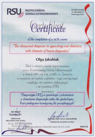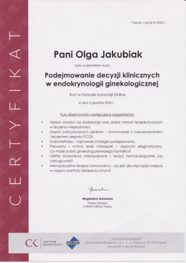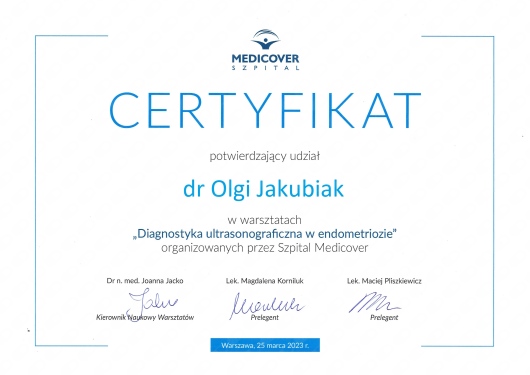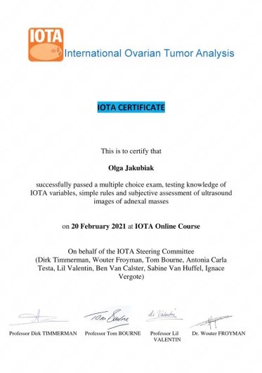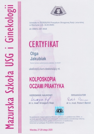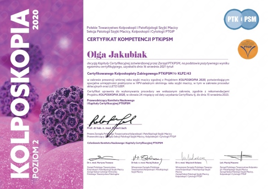 Posiada certyfikat badań kolposkopowych Polskiego Towarzystwa Kolposkopii i Patofizjologii Szyjki Macicy, Europejskiej Federacji Kolposkopii(EFC) oraz certyfikat The International Ovarian Tumor Analysis (IOTA).