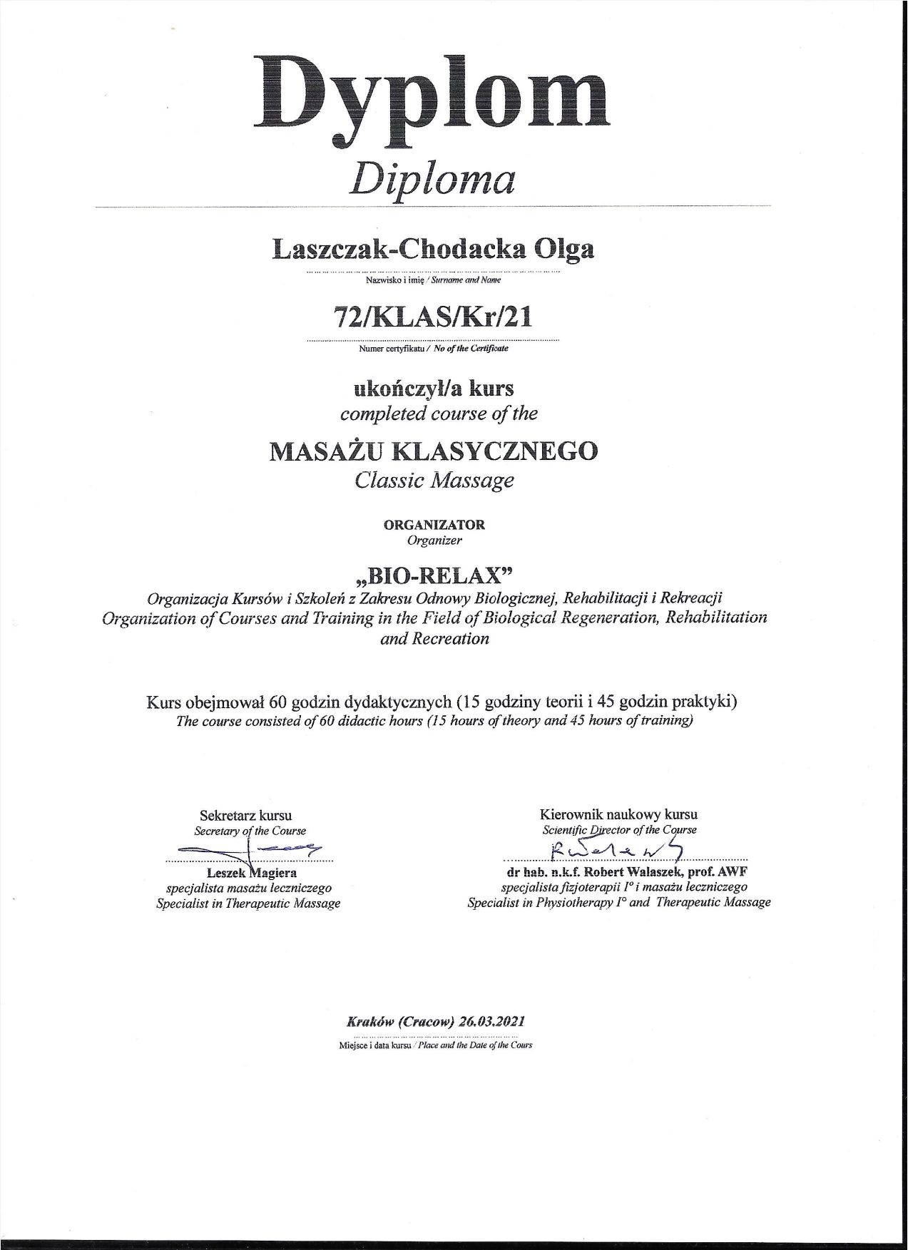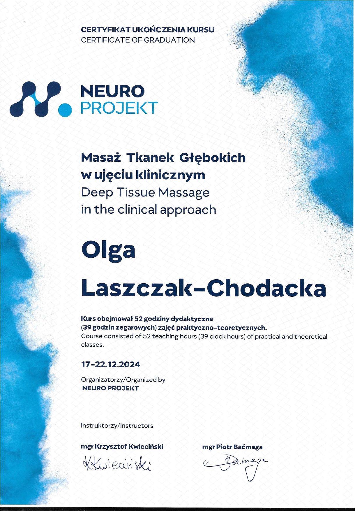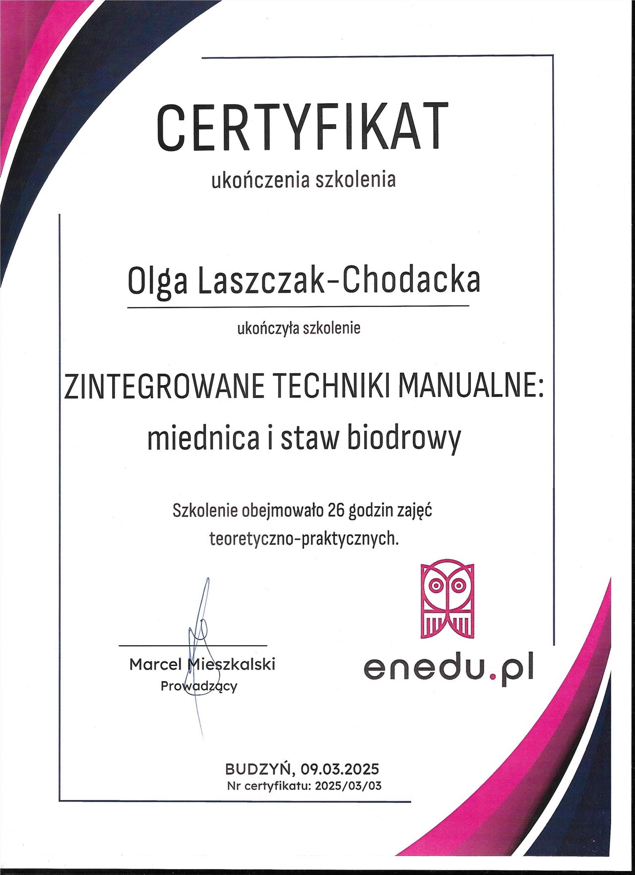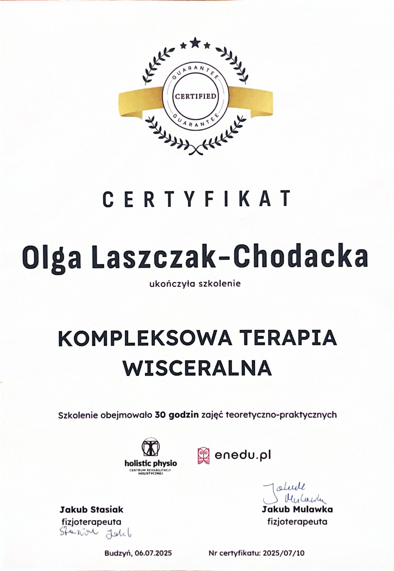 Jaki jest zakres porad oferowanych przez Olga Laszczak-Chodacka?Olga Laszczak-Chodacka to fizjoterapeuta. Na podstawie swojego doświadczenia i wykształcenia Olga Laszczak-Chodacka oferuje usługi takie jak: konsultacja fizjoterapeutyczna, rehabilitacja ortopedyczna, rehabilitacja sportowców, rehabilitacja pooperacyjna, rehabilitacja oddechowa, Terapia manualna, fizjoterapia, Stan ostry - Fizjoterapia, terapia wisceralna.