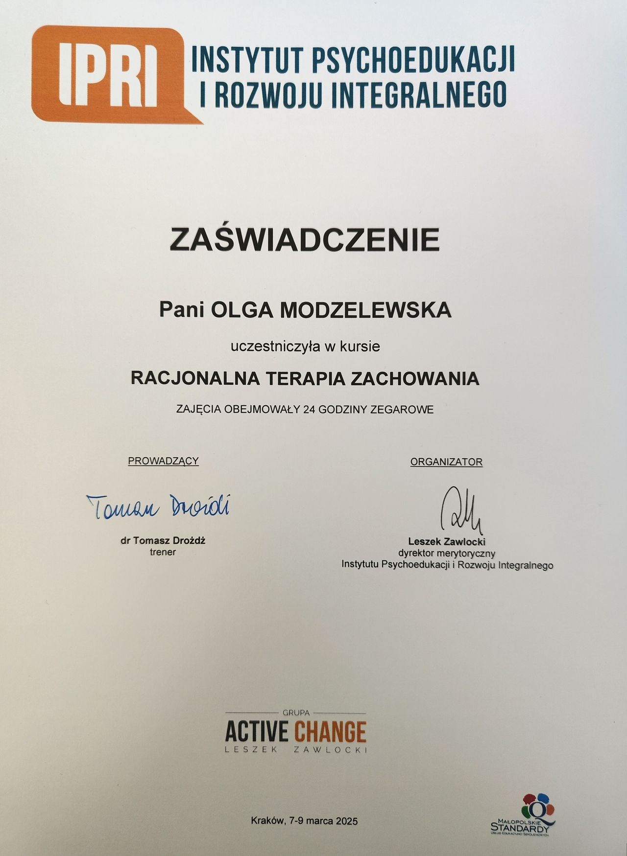 Stale poszerzam moją wiedzę, uczestnicząc w warsztatach, które wzbogacają repertuar technik pracy z klientem.