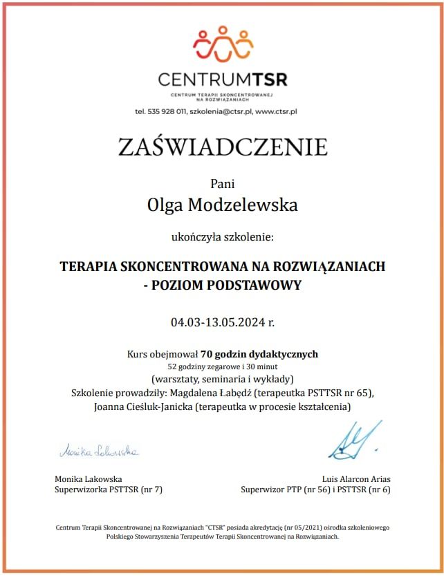Elementy Terapii Skoncentrowanej na Rozwiązaniach (TSR) pozwalają nam skupić się na zasobach, mocnych stronach i konkretnych krokach prowadzących do pożądanej zmiany, zamiast wyłącznie na problemach.