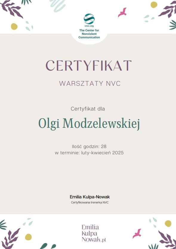 Z kolei Komunikacja bez Przemocy (NVC) wspiera rozwijanie uważności na własne potrzeby i emocje oraz budowanie bardziej satysfakcjonujących, autentycznych relacji z innymi.