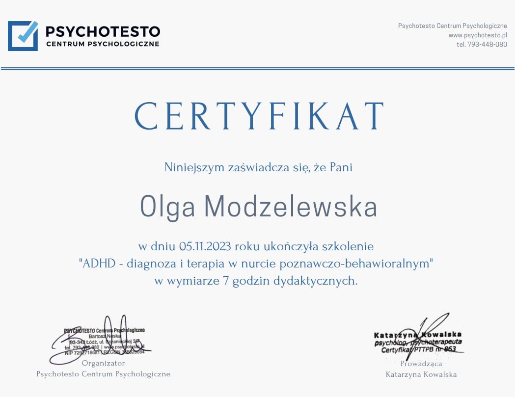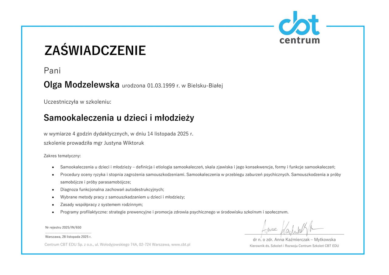 Nazywam się Olga Modzelewska, jestem psychologiem. Pracuję z osobami, które szukają bezpiecznej i życzliwej przestrzeni do rozmowy, zrozumienia siebie i lepszego radzenia sobie z codziennymi trudnościami. Wspieram osoby neuroróżnorodne oraz zmagające się z kryzysami, zaburzeniami nastroju, obniżonym poczuciem własnej wartości i spadkiem motywacji.