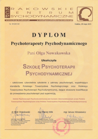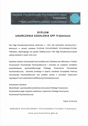 Jestem absolwentką Psychologii na Uniwersytecie Gdańskim. Szkolenie psychoterapeutyczne ukończyłam w Szkole Psychoterapii Psychodynamicznej w Krakowie. W 2015 r. uzyskałam Dyplom Psychoterapeuty Psychodynamicznego. Z potrzeby dalszego rozwoju i pogłębiania wiedzy zdecydowałam się na podnoszenie kwalifikacji w Ośrodku Psychoterapii Psychoanalitycznej „Trójmiasto”, gdzie w 2020r. ukończyłam Studium Psychoterapii Psychoanalitycznej. Kontynuuję rozwój zawodowy biorąc udział w grupach superwizyjno – seminaryjnych. Uczestniczyłam w wielu warsztatach i konferencjach. Doświadczenie zdobywałam zarówno w instytucjach (oświata, służba zdrowia) jak i od kilku lat w prywatnym gabinecie.