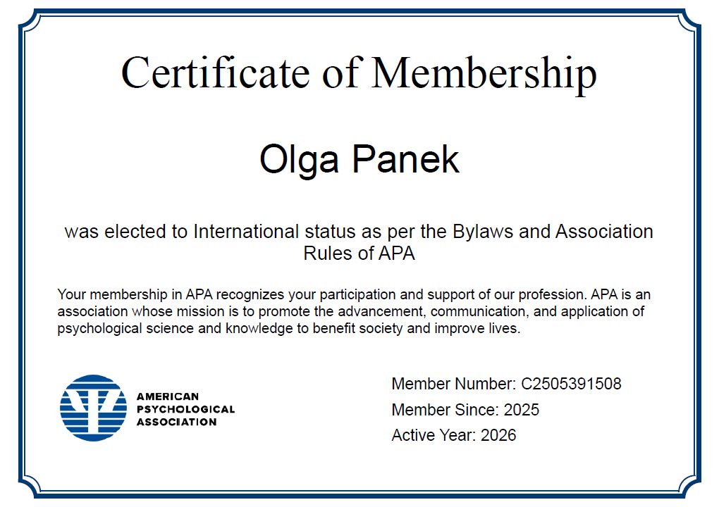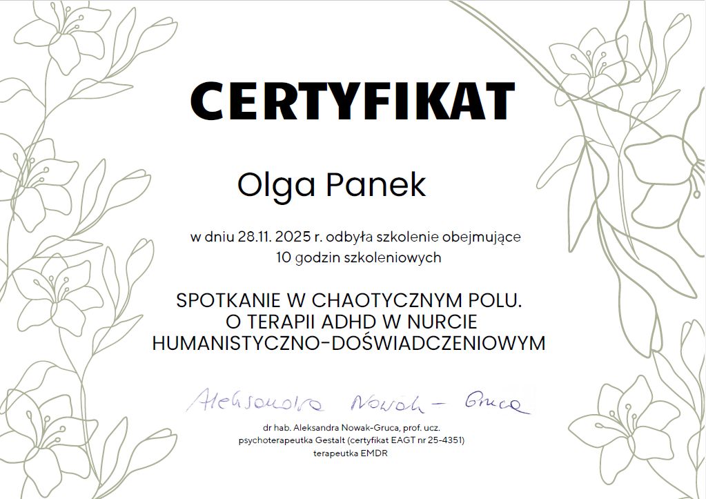 Jestem psycholożką, life coachem w nurcie skoncentrowanym na rozwiązaniach. W 2026 r. rozpoczęłam również studia w szkole psychoterapii Instytutu Integralnej Psychoterapii Gestalt. Jestem członkinią Polskiego Towarzystwa Psychologicznego (PTP), Polskiego Towarzystwa Psychoterapii Gestalt (PTPG) oraz Amerykańskiego Towarzystwa Psychologicznego (APA). Wiedzę z zakresu psychologii zdobyłam kończąc studia na Uniwersytecie Jagiellońskim w 2016 r., a swoje umiejętności pracy z pacjentami regularnie doskonalę w ramach szkoleń psychologicznych i psychoterapeutycznych. Doświadczenie zawodowe zdobywałam podczas zajęć studenckich w Szpitalu Specjalistycznym im. Ludwika Rydygiera w Krakowie, w ramach praktyki własnej pracując z klientami indywidualnymi oraz prowadząc szkolenia psychoedukacyjne w Szwajcarii i w Polsce oraz obecnie w Mazowieckim Specjalistycznym Centrum Zdrowia im. prof. Jana Mazurkiewiczna w Pruszkowie.