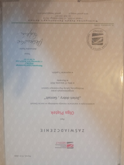 Pracuję jako psycholożka i psychoterapeutka w nurcie humanistyczno-doświadczeniowym Gestalt. Praca w tym nurcie oparta jest na dialogu, podczas którego będziesz mogła/mógł przyjrzeć się swoim trudnościom, poznać ich źródła i szukać nowych sposobów radzenia sobie. Wykorzystuję także pracę z ciałem, która pozwala dotrzeć do emocji, uczuć i potrzeb, a w efekcie prowadzi do głębszego zrozumienia siebie. Ważne jest dla mnie stworzenie przestrzeni, w której będziesz mogła/mógł spotkać się ze sobą w akceptacji i trosce. Wierzę, że wszyscy posiadamy zdolność do uzdrowienia samych siebie, a dla mnie zaszczytem jest uczestniczenie i wspieranie klientów w tej podróży. Zapraszam Cię na sesję, jeśli doświadczasz: - kryzysu, - uczucia niepokoju, -zaburzeń lękowych, -zaburzeń nastroju, - niskiej samooceny, - trudności w relacjach, - trudności związanych z podjęciem decyzji, - poczucia niezrozumienia własnych uczuć i emocji, - trudności w odnalezieniu się w nowych okolicznościach, po odejściu z destrukcyjnej sekty lub relacji. Jestem psycholożką i psychoterapeutką. Studia magisterskie z psychologii ukończyłam na Uniwersytecie SWPS. Pierwszy, dwuletni etap szkolenia psychoterapeutycznego odbyłam w Wielkopolskiej Szkole Psychoterapii Gestalt, natomiast drugi, trzyletni, w Instytucie Integralnej Psychoterapii Gestalt. Moje doświadczenie zawodowe nabywałam m. in. w poznańskim oddziale Centrum Praw Kobiet oraz Pracowni Psychoterapii i Seksuologii Profundum w Poznaniu, gdzie udzielałam pomocy psychologicznej głównie osobom po doświadczeniach przemocy oraz ich bliskim. Pracowałam także w Punkcie Informacyjno-konsultacyjnym dla osób uzależnionych i ich bliskich na Żoliborzu. Posiadam doświadczenie w pracy psychoterapeutycznej z osobami dorosłymi doświadczającymi szerokiego zakresu problemów: zaburzeń lękowych, nastroju i depresji, trudności w relacjach, a także z osobami, które odeszły z destrukcyjnych sekt i grup społecznych. Odbyłam także specjalistyczne warsztaty z zakresu pomocy pacjentom po doświadczeniu traum, organizowane przez International Cultic Studies Association oraz Centrum Praw Kobiet. Pracuję także ze studentami jako prowadząca zajęcia. Prywatnie lubię biesiadowanie w gronie najbliższych, spacery i kulinarne podróże, taniec. Moją pasją jest rozwój, a szans na niego staram się szukać zarówno w codziennych aktywnościach, jak i na przeróżnych warsztatach. Lubię śpiewać i spędzać czas na łonie natury. W gabinecie udzielam konsultacji, oferuję wsparcie psychologiczne i prowadzę psychoterapię osób dorosłych i par. Pracuję pod stałą superwizją. Pracuję także zdalnie i w języku angielskim.