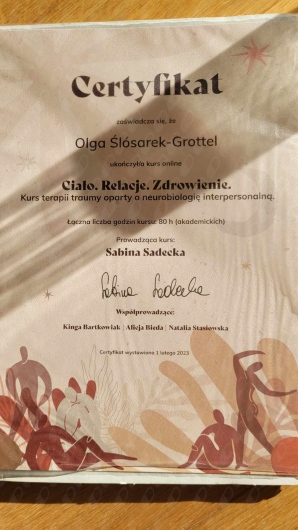 Nazywam się Olga Ślósarek-Grottel i jestem psycholożką. Studia magisterskie na kierunku psychologia (specjalność kliniczna) ukończyłam na Uniwersytecie SWPS w Poznaniu. Staram się nieustannie poszerzać swoją wiedzę i kompetencje biorąc udział w kursach i szkoleniach. Ukończyłam kurs podstawowy psychoterapii systemowej indywidualnej i rodzin w Wielkopolskim Towarzystwie Terapii Systemowej w Poznaniu. Dodatkowo szkoliłam się w ramach warsztatu Terapii Akceptacji i Zaangażowania, kursu terapii traumy oraz szkolenia z interwencji kryzysowej. Doświadczenie zdobywałam w Centrum Praw Kobiet w Poznaniu oraz Fundacji Niepodzielni. Oprócz konsultacji psychologicznych, wsparcia psychologicznego i interwencji kryzysowej zajmuje się także prowadzeniem warsztatów psychoedukacyjnych. Podczas naszych spotkań skupimy się na opowieściach, które przyniesiesz ze sobą do gabinetu, przyjrzymy się im i zastanowimy, czy mogą brzmieć tylko w ten sposób i jak Ty chcesz je opowiadać. Inaczej mówiąc: spojrzymy na sytuacje, które są dla Ciebie problematyczne z różnych perspektyw i zastanowimy się jak można wprowadzić w ich obszarze zmianę. Będziemy obserwować emocje, ciało, zachowania i relacje, dotrzemy do Twoich zasobów i źródeł siły. Moim celem jest doprowadzenie do momentu, w którym opuszczając gabinet będziesz wiedział/a, w którym kierunku chcesz dalej podążać, jakie wartości realizować i co przybliża Cię do życia, którym chcesz żyć. W czym mogę pomóc? - trudności w bliskich relacjach, trudności interpersonalne - trudności w radzeniu sobie z emocjami - depresja, obniżony nastrój - kryzysy życiowe (rozwód, kryzys w związku, utrata zdrowia) - życie z doświadczaniem przemocy (psychicznej, fizycznej, ekonomicznej) - żałoba, doświadczenie straty - nadmierny stres, napięcie - niska samoocena - odczuwanie lęku, niepokoju - wypalenie zawodowe, rodzicielskie - poszukiwanie własnej drogi życiowej i rozwojowej