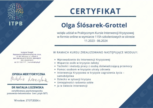 Jaki jest zakres porad oferowanych przez Olga Ślósarek-Grottel?Olga Ślósarek-Grottel to psycholog. Na podstawie swojego doświadczenia i wykształcenia Olga Ślósarek-Grottel oferuje usługi takie jak: Konsultacja psychologiczna, psychoedukacja, interwencja kryzysowa, poradnictwo dla rodziców, poradnictwo psychologiczne, Konsultacja psychologiczna dla par, psychoterapia depresji, konsultacja psychologiczna (kolejna wizyta), konsultacja psychologiczna (pierwsza wizyta), Psychoterapia.