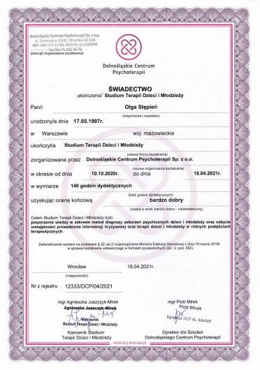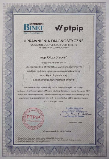 Jestem psycholożką i diagnostką, absolwentką Uniwersytetu SWPS w Warszawie (specjalność: psychologia kliniczna). Doświadczenie zdobywałam m.in. w Dolnośląskim Centrum Psychoterapii, gdzie ukończyłam roczne Studium Terapii Dzieci i Młodzieży. Od wielu lat zajmuję się diagnozą dzieci i młodzieży – w szczególności w kierunku ADHD, spektrum autyzmu (ASD), trudności szkolnych oraz oceną funkcjonowania intelektualnego.