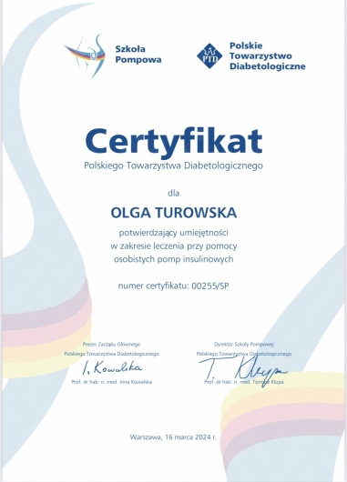 Ukończyłam liczne kursy i szkolenia w zakresie terapii pompowej i ciągłych systemów monitorowania glikemii (m.in. Szkoła Pompowa PTD).