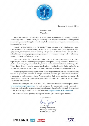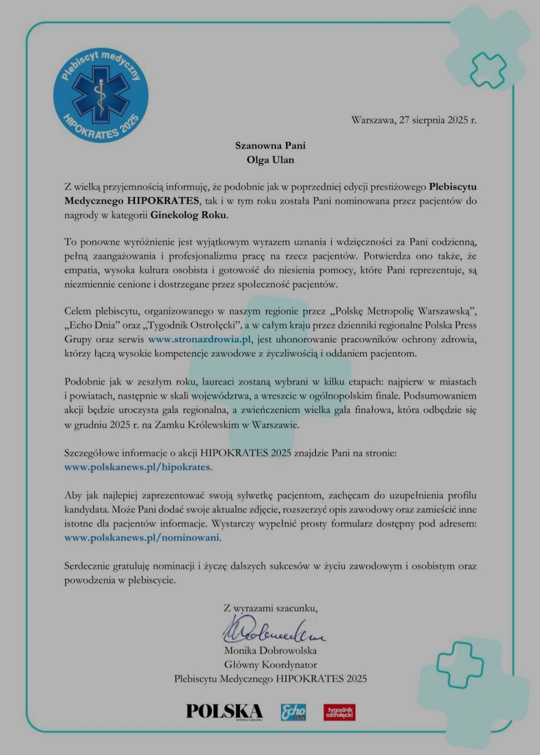 Od początku mojej drogi zawodowej towarzyszy mi przekonanie, że wizyta u ginekologa powinna być spokojnym i bezpiecznym doświadczeniem. Staram się, aby każda pacjentka czuła się wysłuchana, zrozumiana i zaopiekowana. W pracy łączę wiedzę medyczną z empatią i cierpliwością, tak by stworzyć atmosferę zaufania i komfortu.