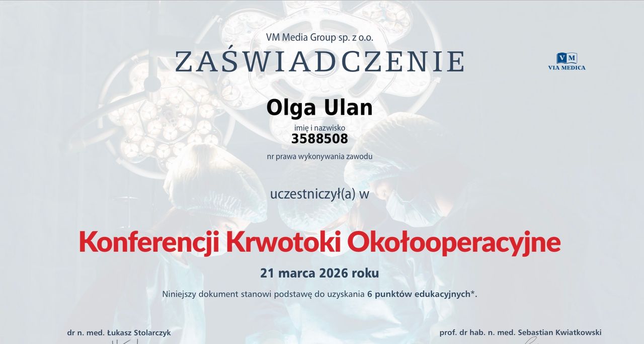 Jestem lekarzem specjalistą ginekologii i położnictwa. Ukończyłam Wydział Lekarski Grodzieńskiego Uniwersytetu Medycznego w 2012 roku, a w 2025 roku zakończyłam specjalizację w dziedzinie położnictwa i ginekologii w Mazowieckim Szpitalu Bródnowskim, w Katedrze i Klinice Położnictwa, Chorób Kobiecych i Ginekologii Onkologicznej Warszawskiego Uniwersytetu Medycznego.
