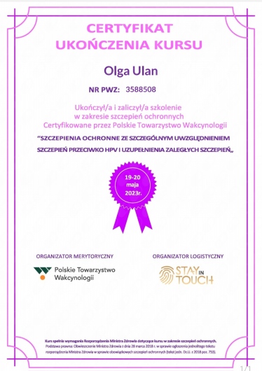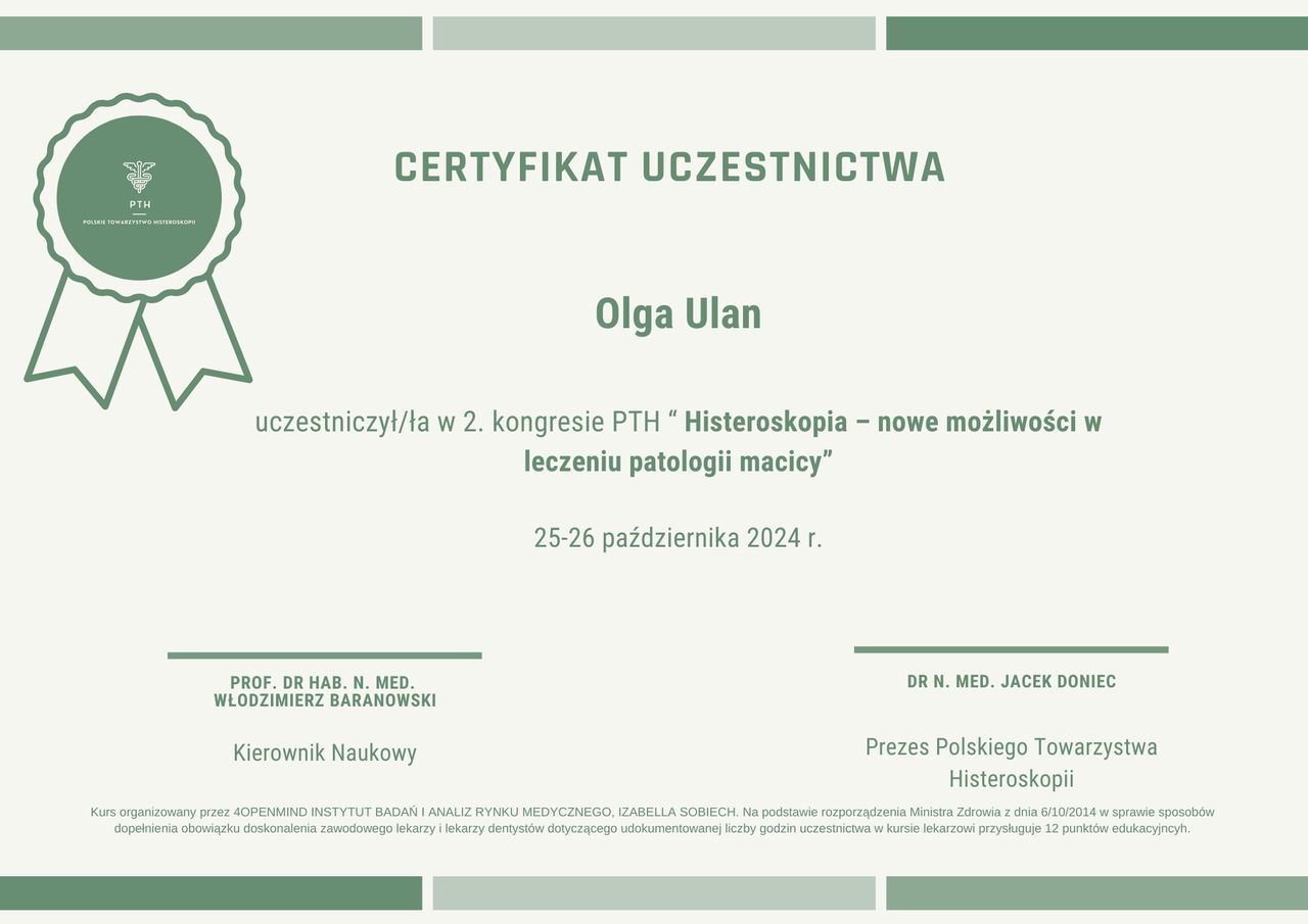 Jestem bardzo zadowolona z wizyty u Pani Olgi. Niesamowicie empatyczna i ciepła osoba, a do tego bardzo profesjonalna. Badanie przebiegło delikatnie, a wszystkie wątpliwości zostały jasno wyjaśnione. Zdecydowanie polecam!
