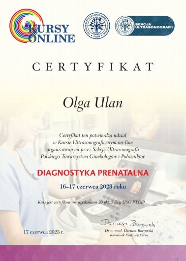 Jestem bardzo szczęśliwa, że trafiłam do Pani Olgi. To już moja kolejna wizyta, tym razem potwierdzenie ciąży. Każda wizyta daje mi poczucie bezpieczeństwa. USG wykonuje bardzo dokładnie, a wszystko cierpliwie i z uśmiechem wyjaśnia. Widać ogromne doświadczenie i pasję do pracy. Niezwykle miła, ciepła i profesjonalna osoba – serdecznie polecam.
