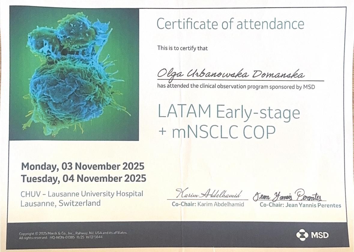 Od kilku lat jestem zaangażowana w pracę Europejskiego Ośrodka Diagnostyki i Leczenia Raka Płuca działającego w Centrum Onkologii w Bydgoszczy. Należę również do Polskiego Towarzystwa Onkologii Klinicznej i Europejskiego Towarzystwa Onkologii Klinicznej.