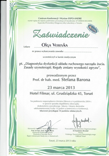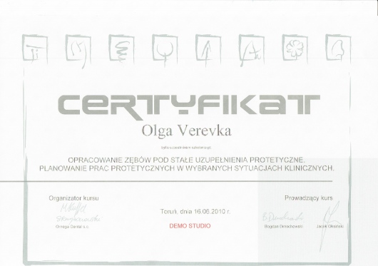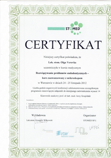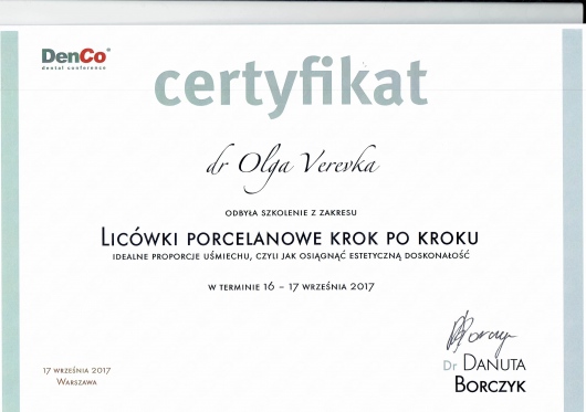 Jaki jest zakres porad oferowanych przez Olga Verevka?Olga Verevka to stomatolog. Na podstawie swojego doświadczenia i wykształcenia Olga Verevka oferuje usługi takie jak: protezy szkieletowe, leczenie kanałowe, korona porcelanowa na metalu, konsultacja protetyczna, scaling + piaskowanie, odbudowa zębów, wypełnienie kompozytowe, licówka ceramiczna, Konsultacja stomatologiczna.