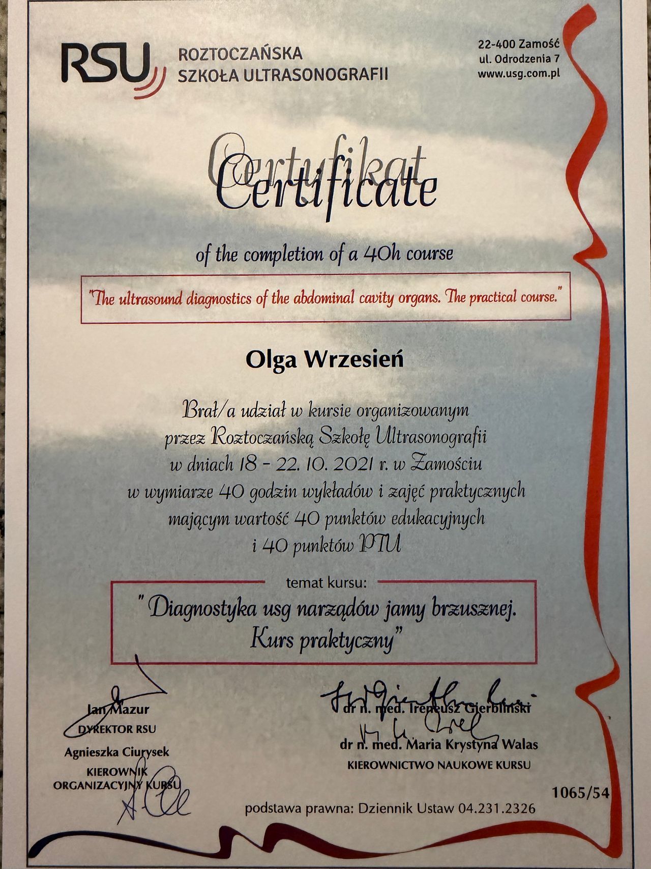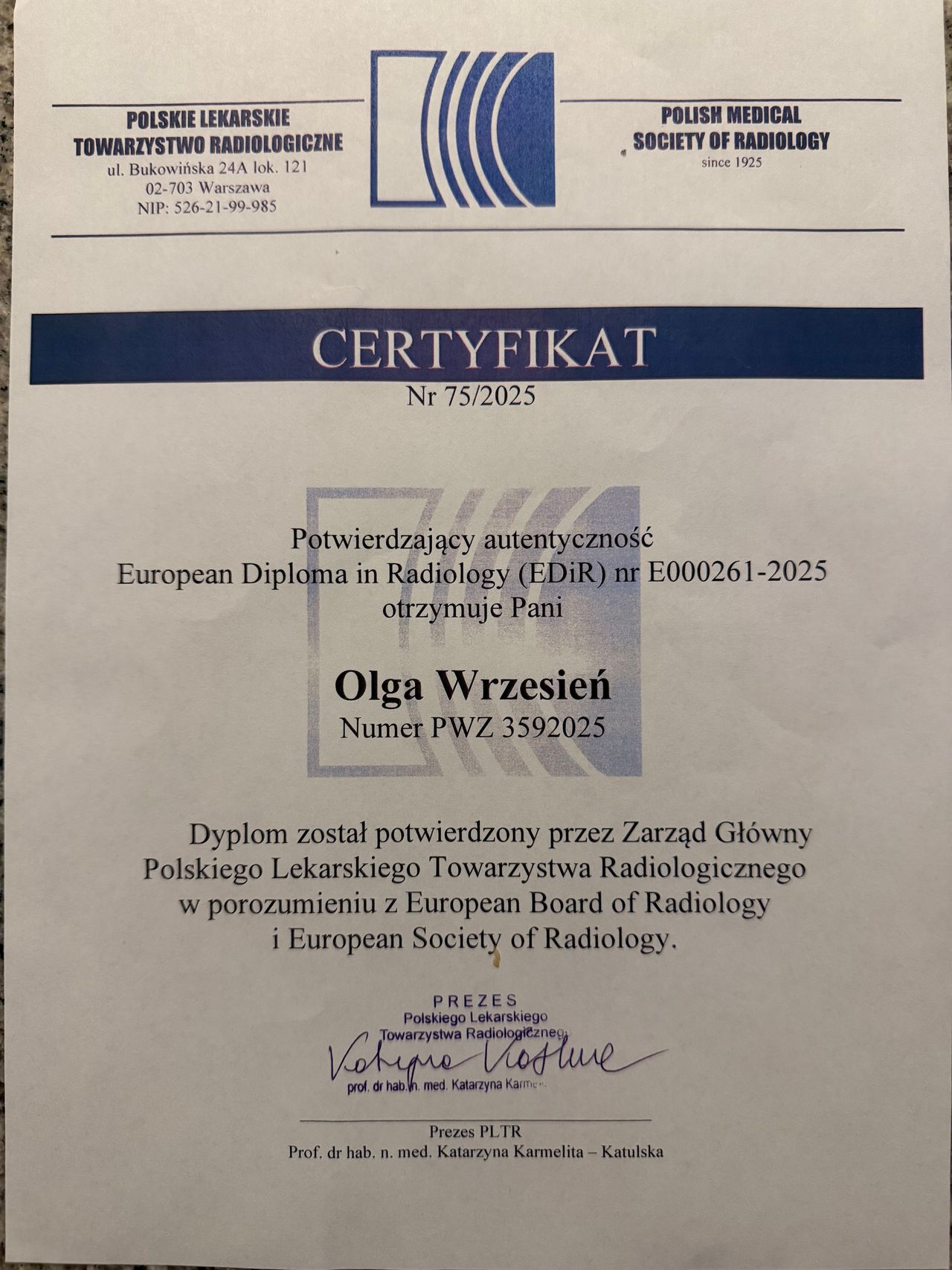 Ukończyłam studia lekarskie na Warszawskim Uniwersytecie Medycznym. Po uzyskaniu prawa wykonywania zawodu kontynuowałam swoją edukację i zdobywałam doświadczenie w Zakładzie Radiologii Pediatrycznej Dziecięcego Szpitala Klinicznego Warszawskiego Uniwersytetu Medycznego, gdzie odbyłam rezydenturę z Radiologii i Diagnostyki Obrazowej. Tytuł lekarza specjalisty uzyskałam zdobywając międzynarodowy certyfikat z radiologii- European Diploma in Radiology, wydawany przez Europejską Radę Radiologii (EBR). Ponadto jestem członkiem Polskiego Lekarskiego Towarzystwa Radiologicznego oraz systematycznie poszerzam swoją więdzę na konferencjach i sympozjach.