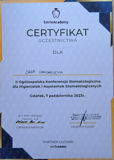 Jaki jest zakres porad oferowanych przez Olha Chuchuieva?Olha Chuchuieva to higienistka/higienista stomatologiczny. Na podstawie swojego doświadczenia i wykształcenia Olha Chuchuieva oferuje usługi takie jak: piaskowanie, profilaktyka próchnicy, lakowanie zębów, usuwanie kamienia nazębnego, scaling, higienizacja, pakiet higienizacyjny, trening higieny z instruktażem, fluoryzacja zębów, Konsultacja higienistki.
