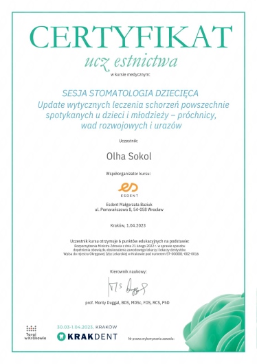 Dzięki doświadczeniu w pracy z dziećmi, potrafię wprowadzić maluchy w atmosferę bezstresowego leczenia. Przeprowadzam zabiegi stomatologiczne w sedacji , dbając o komfort pacjentów szczególnie w przypadku trudniejszych procedur.