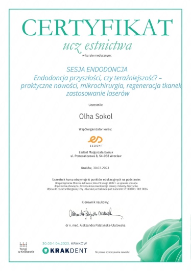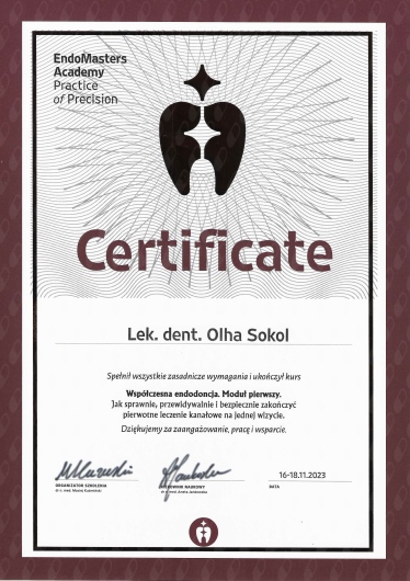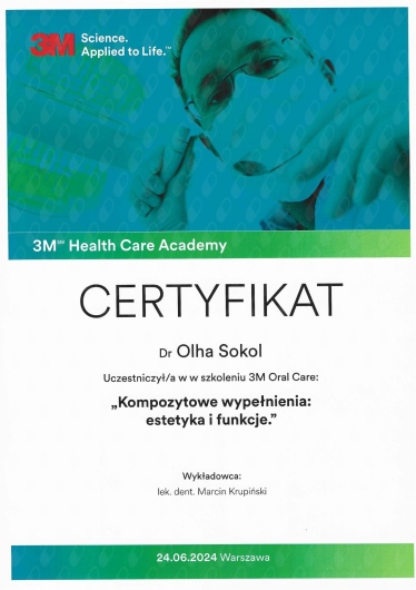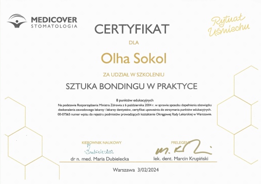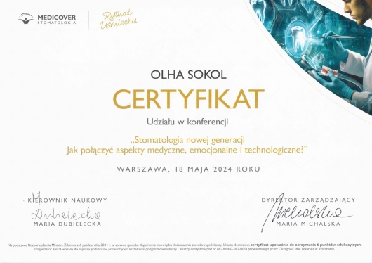Jaki jest zakres porad oferowanych przez Olha Sokol?Olha Sokol to stomatolog. Na podstawie swojego doświadczenia i wykształcenia Olha Sokol oferuje usługi takie jak: Konsultacja stomatologiczna, leczenie próchnicy, stomatologia estetyczna, Wybielanie zębów, Leczenie próchnicy u dzieci, Stomatologia zachowawcza.
