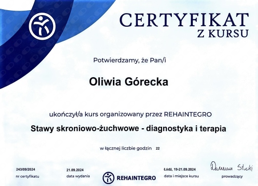 Jaki jest zakres porad oferowanych przez Oliwia Górecka?Oliwia Górecka to fizjoterapeuta. Na podstawie swojego doświadczenia i wykształcenia Oliwia Górecka oferuje usługi takie jak: Masaż twarzy Kobido, Fizjoterapia stawów skroniowo-żuchwowych, Masaż leczniczy, fizjoterapia stomatologiczna, Fizjoterapia szczęki, fizjoterapia szczękowo- twarzowa, napięciowe bóle głowy, terapia napięciowych bólów głowy dorośli, terapia napięciowych bólów głowy dzieci powyżej 7 r.ż, Rehabilitacja stawów skroniowo-żuchwowych.