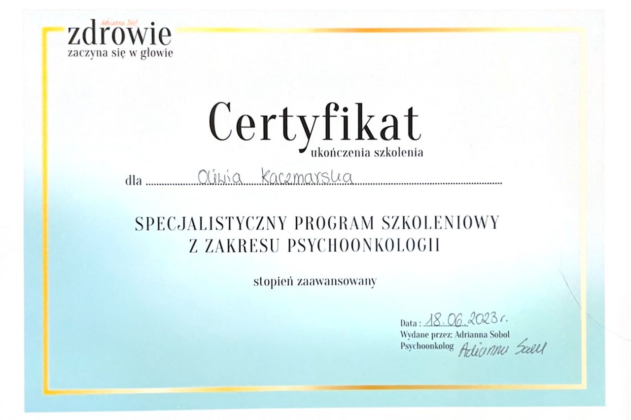 Jaki jest zakres porad oferowanych przez Oliwia Kaczmarska?Oliwia Kaczmarska to psycholog, psychoonkolog. Na podstawie swojego doświadczenia i wykształcenia Oliwia Kaczmarska oferuje usługi takie jak: Konsultacja psychologiczna.