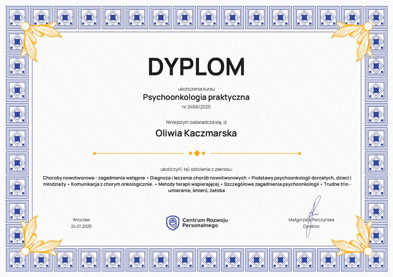 Jestem psychologiem o specjalności klinicznej, psychoonkologiem, a także członkinią Polskiego Towarzystwa Psychoonkologicznego (PTPO) i Amerykańskiego Towarzystwa Psychologicznego (APA). Z oddaniem i troską wspieram pacjentów w trudnych momentach życia.