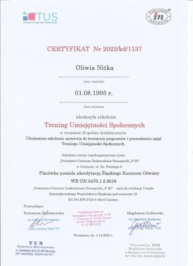 Specjalistyczne z Treningu Umiejętności Społecznych. Posiadam również uprawnienia