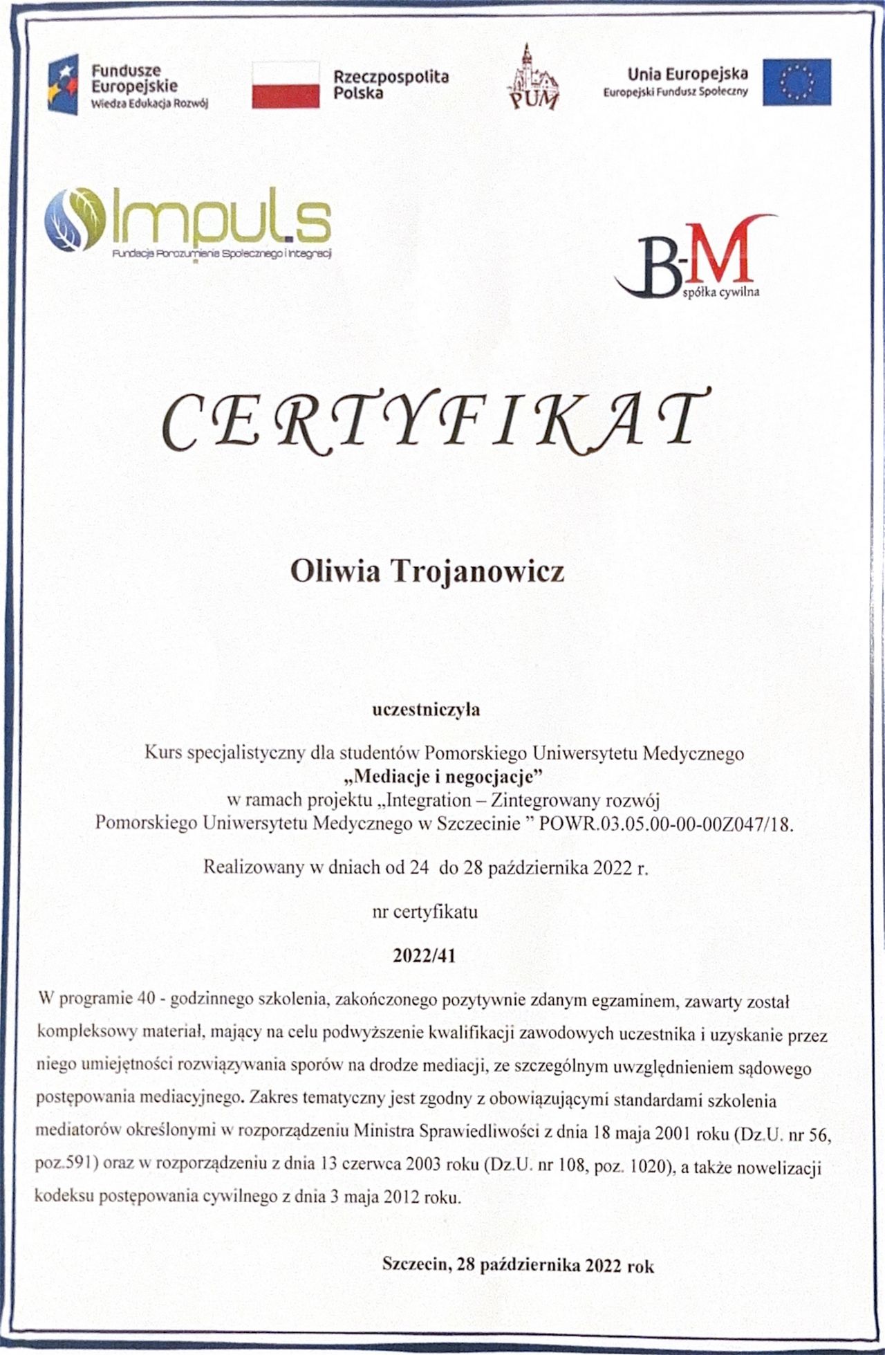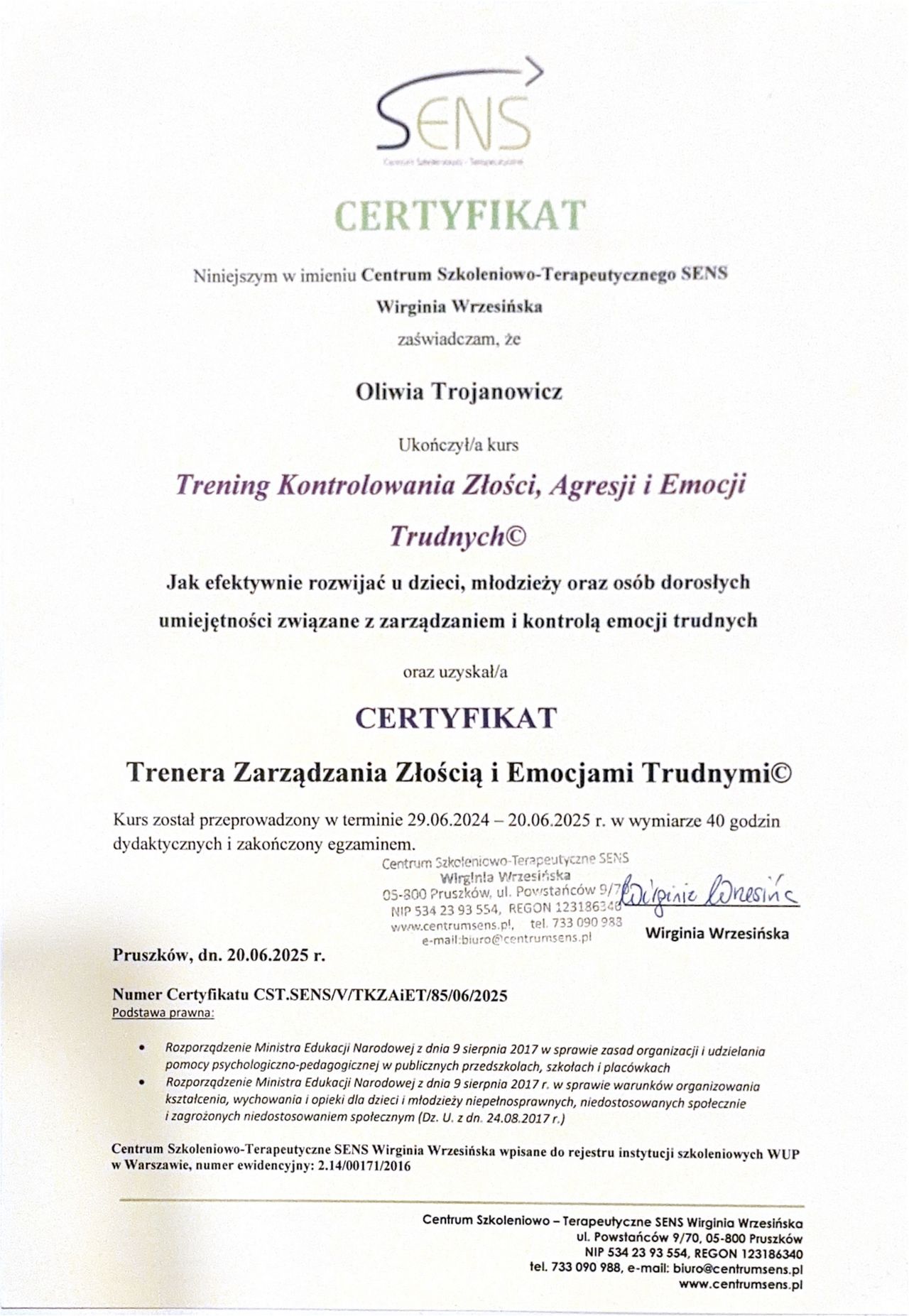 Stale rozwijam swoje kompetencje zawodowe, a także podnoszę kwalifikacje, regularnie uczestnicząc w szkoleniach oraz kursach specjalistycznych. Swoją pracę poddaję superwizji.