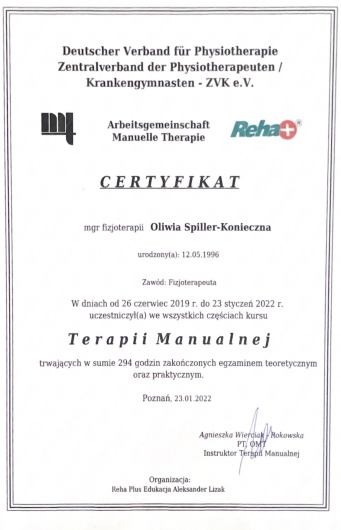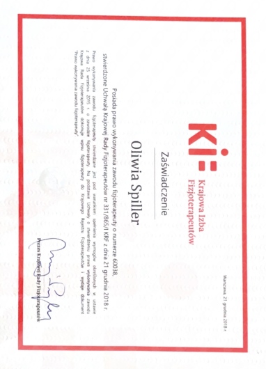 Ciepła, empatyczna i zaangażowana Pani Oliwia jak nikt inny wie co robi. Korzystałam z usług Pani Oliwii z synkiem a teraz i ja po operacji kręgosłupa udałam się do niej, daje jasne instrukcje, konkretnie odpowiada na wszystkie pytania. Pani Oliwia od razu przechodzi do działania a po zebranym wywiadzie i informacjach ustala plan oraz dalsze kroki związane z rehabilitacją/fizjoterapią. Jestem ogromnie wdzięczna za wsparcie otrzymane w gabinecie i danie nadzieji na odrobinę lepsze życie, to pierwsza osoba która nie olała sprawy i nie rozłożyła rąk w geście ”bezradności”jak robili to wszyscy lekarze, nie bagatelizuje, wysłucha z szacunkiem i objaśni wszystko jeśli czegoś się nie wie bądź nie rozumie. Pierwszy raz nie mogę doczekać się kolejnej wizyty w gabinecie Mogę polecić z czystym sumieniem.