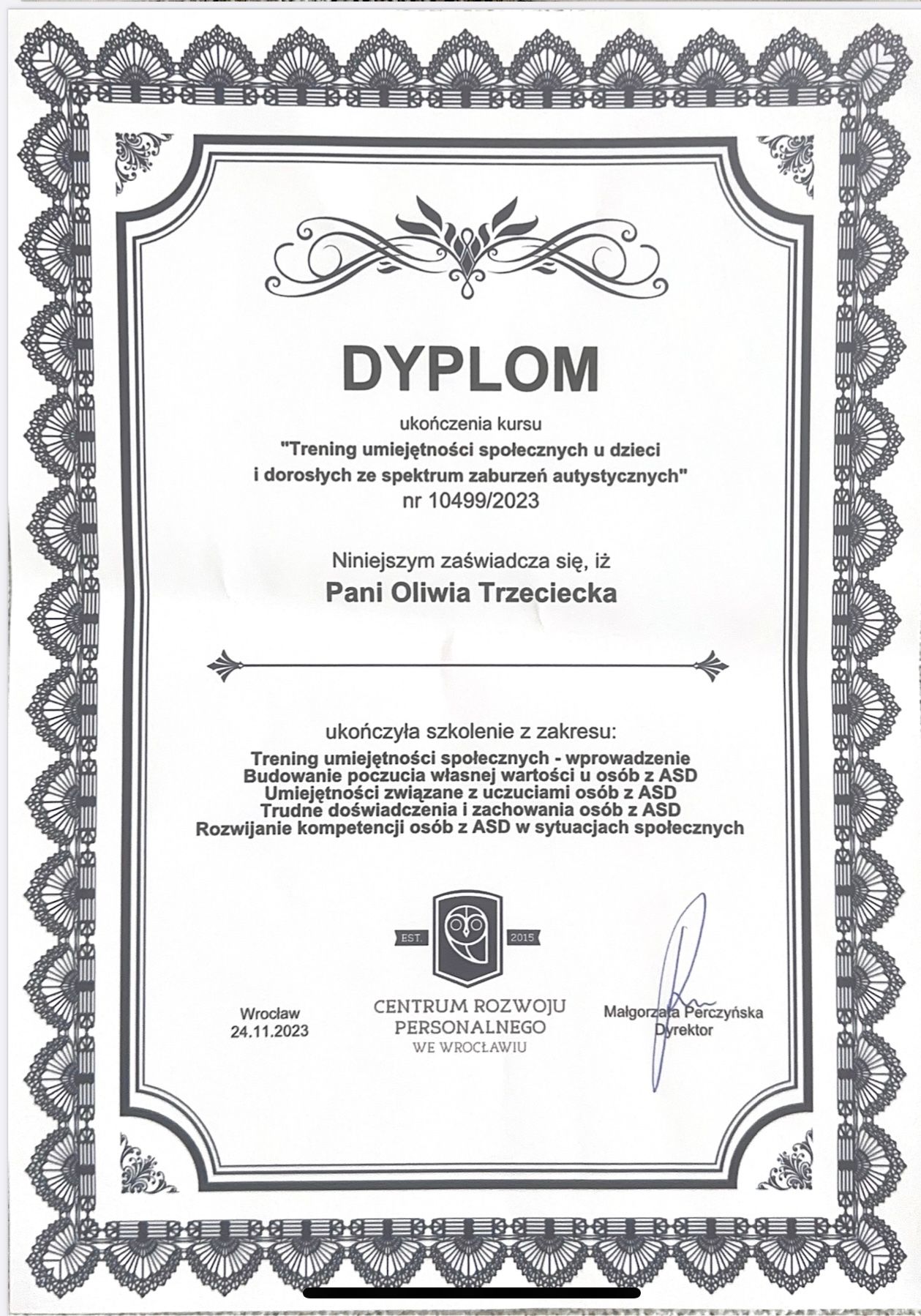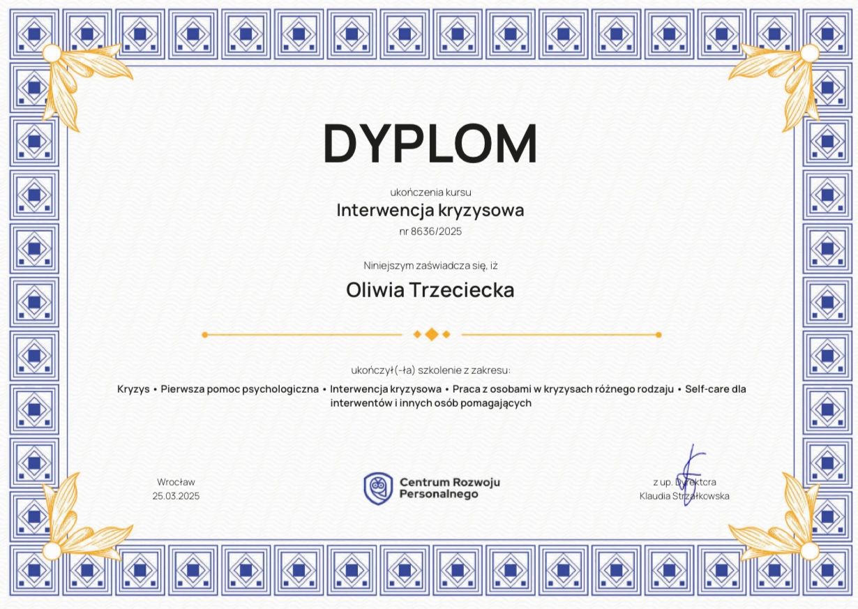 Nazywam się Oliwia Trzeciecka i jestem psychologiem. Ukończyłam studia psychologiczne na Uniwersytecie Wrocławskim, specjalizując się w obszarze psychologii klinicznej oraz zdrowia dorosłych. Moje doświadczenie zawodowe obejmuje również wolontariat w Fundacji Opieka i Troska w Domu Wspólnym – placówce wspierającej osoby z zaburzeniami psychicznymi, które potrzebują pomocy w codziennych obowiązkach. Dodatkowo posiadam certyfikat Trenera Umiejętności Społecznych (TUS), ukończyłam również szkolenie z interwencji kryzysowej oraz kurs dotyczący diagnozowania ADHD u osób dorosłych W swojej pracy łączę podejście oparte na psychologii pozytywnej z różnorodnymi metodami terapii. Moim celem jest wspieranie osób w radzeniu sobie z wewnętrznymi trudnościami, odkrywaniu ich zasobów i pełnego potencjału. Moja misja to pomoc w przezwyciężaniu życiowych wyzwań oraz wspieranie w procesie osobistego rozwoju. Współpracuję z osobami, które borykają się z: Depresją i zaburzeniami nastroju – pomagam zrozumieć przyczyny obniżonego nastroju, uczucia pustki i braku energii, wspieram w powrocie do zdrowia psychicznego. Lękami i zaburzeniami lękowymi – pracuję z osobami zmagającymi się z fobiami, atakami paniki oraz innymi formami lęku. Razem szukamy skutecznych strategii zarządzania stresem. Zaburzeniami adaptacyjnymi – wspieram w adaptacji do trudnych sytuacji życiowych, takich jak utrata pracy, rozwód czy zmiana miejsca zamieszkania. Problemami interpersonalnymi i relacyjnymi – pomagam w budowaniu zdrowych relacji, poprawie komunikacji i rozwiązywaniu konfliktów. Pomagam również w odkrywaniu mocnych stron, wyznaczaniu celów życiowych oraz realizowaniu marzeń. Skupiam się na budowaniu pewności siebie, motywacji oraz umiejętności potrzebnych do osiągania sukcesów w życiu osobistym i zawodowym. W swojej pracy wykorzystuję różne podejścia terapeutyczne, dostosowane do indywidualnych potrzeb klienta: Terapia poznawczo-behawioralna (CBT) – pomoc w zmianie negatywnych wzorców myślenia i zachowań. Terapia psychodynamiczna – zrozumienie głębszych, często nieświadomych przyczyn problemów emocjonalnych. Psychologia pozytywna – wspieram w poprawie samopoczucia, budowaniu poczucia satysfakcji z życia, a także zwiększaniu nadziei i optymizmu. Zapraszam do współpracy osoby, które: Czują się zagubione i potrzebują wsparcia w znalezieniu nowej drogi, Doświadczają trudności emocjonalnych, które są poza ich kontrolą, Pragną lepiej zrozumieć siebie i rozwijać się osobowościowo, Szukają pomocy w radzeniu sobie z trudnymi wydarzeniami życiowymi, Chcą poprawić jakość swoich relacji z innymi, Zmagają się z niską samooceną, brakiem motywacji lub problemami w wyznaczaniu celów, Są osobami wysoko wrażliwymi, Borykają się z nadmiarem myśli i problemami z wyznaczaniem granic. Pracuję z osobami dorosłymi oraz z młodzieżą od 16 r.ż.