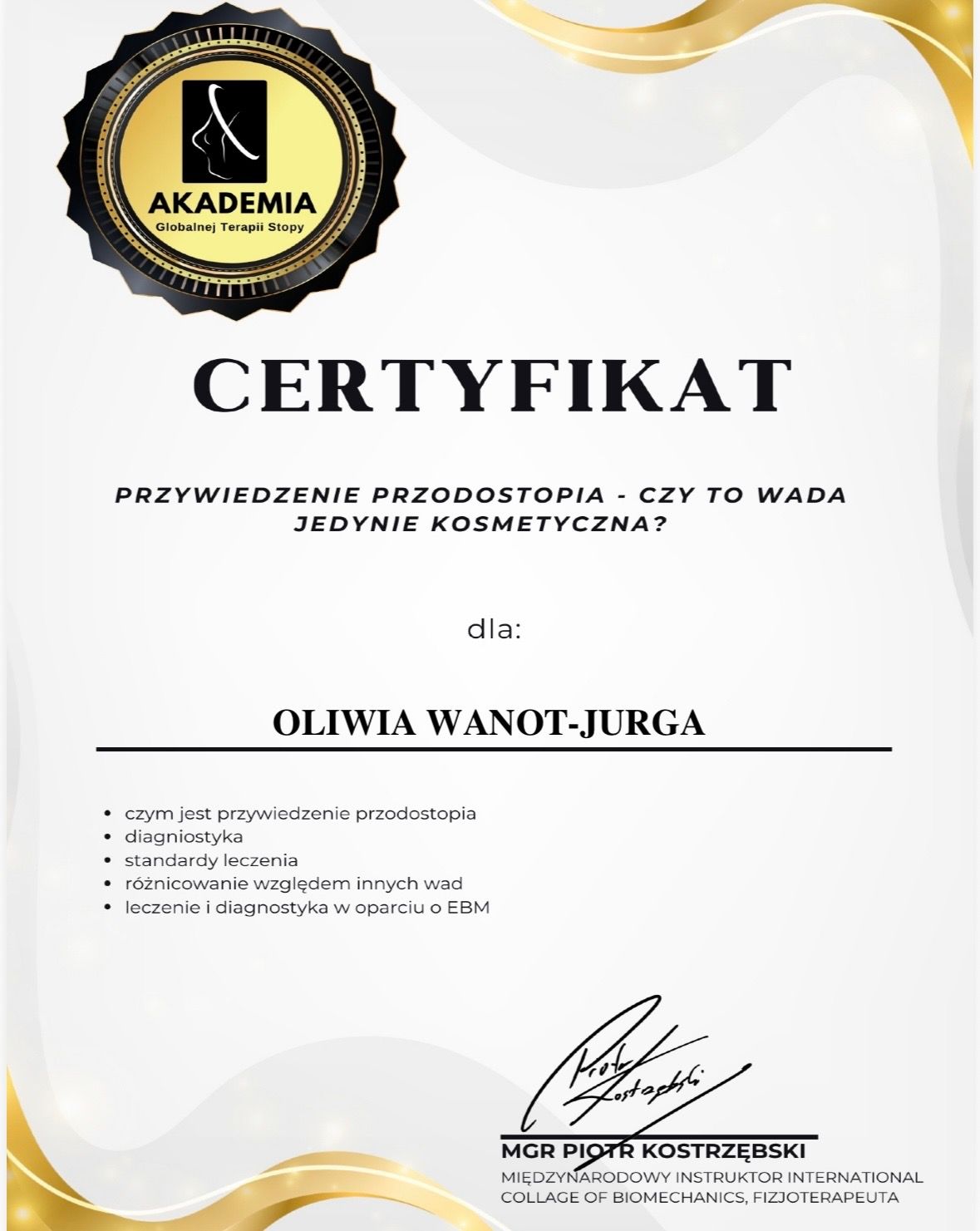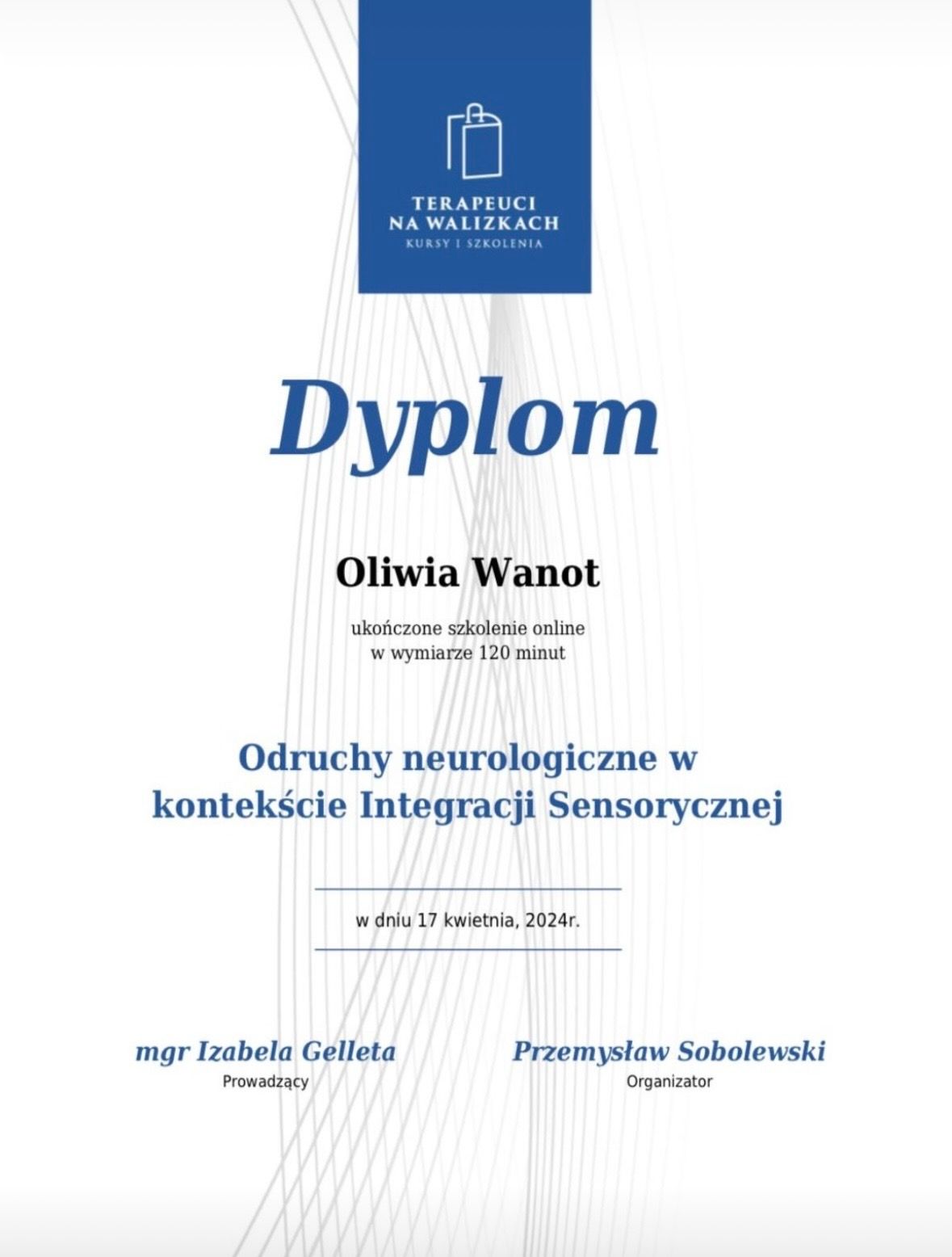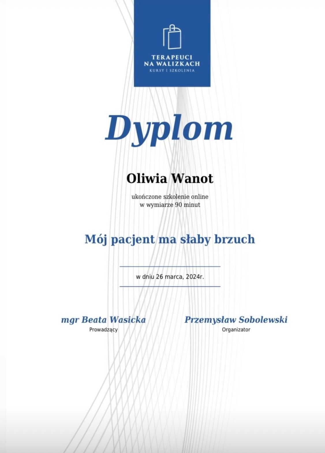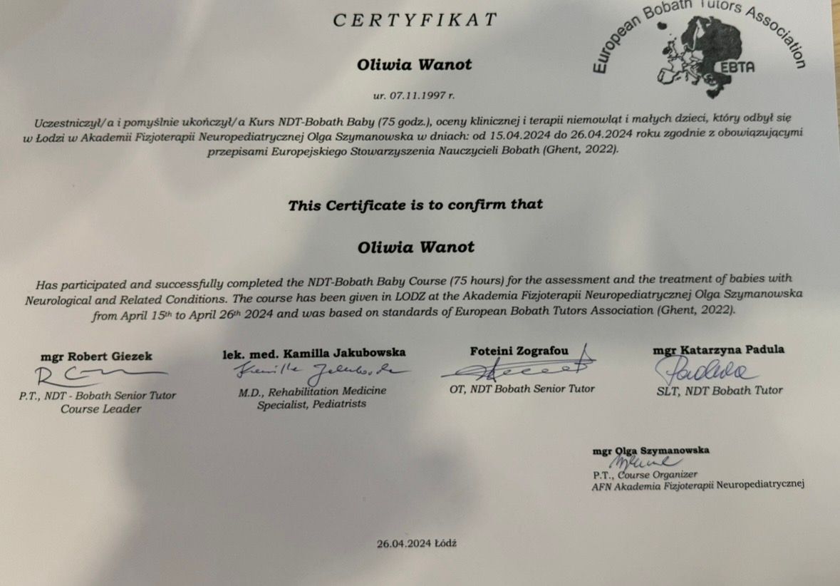 Nazywam się Oliwia Wanot - Jurga, jestem absolwentką Akademii Wychowania Fizycznego w Poznaniu gdzie uzyskałam tytuł magistra Fizjoterapii. Na codzień pracuje w gabinetach prywatnych na terenie Konina oraz prowadzę swój profil w social mediach. Jestem certyfikowanym terapeuta koncepcji Bobath i Bobath Baby, Trójpłaszczyznowej Manualnej Terapii Stóp, diagnostyki Prechtla, Monachijskiej Funkcjonalnej Diagnostyki Rozwojowej i już wkrótce terapeutą metody Vojty. Jestem rownież absolwentką licznych szkoleń z zakresu Fizjoterapii w Pediatrii, oczywiście w planach mam jeszcze kilkanaście szkoleń. Na codzień pracuje z wcześniakami i niemowlakami do 6 miesiąca. Głównymi problemami są: zaburzenia rozwoju ruchowego, asymetria ułożeniowa, kręcze szyjne, zniekształceniami w obrębie czaszki, zaburzenia aktywności mięśniowej,
