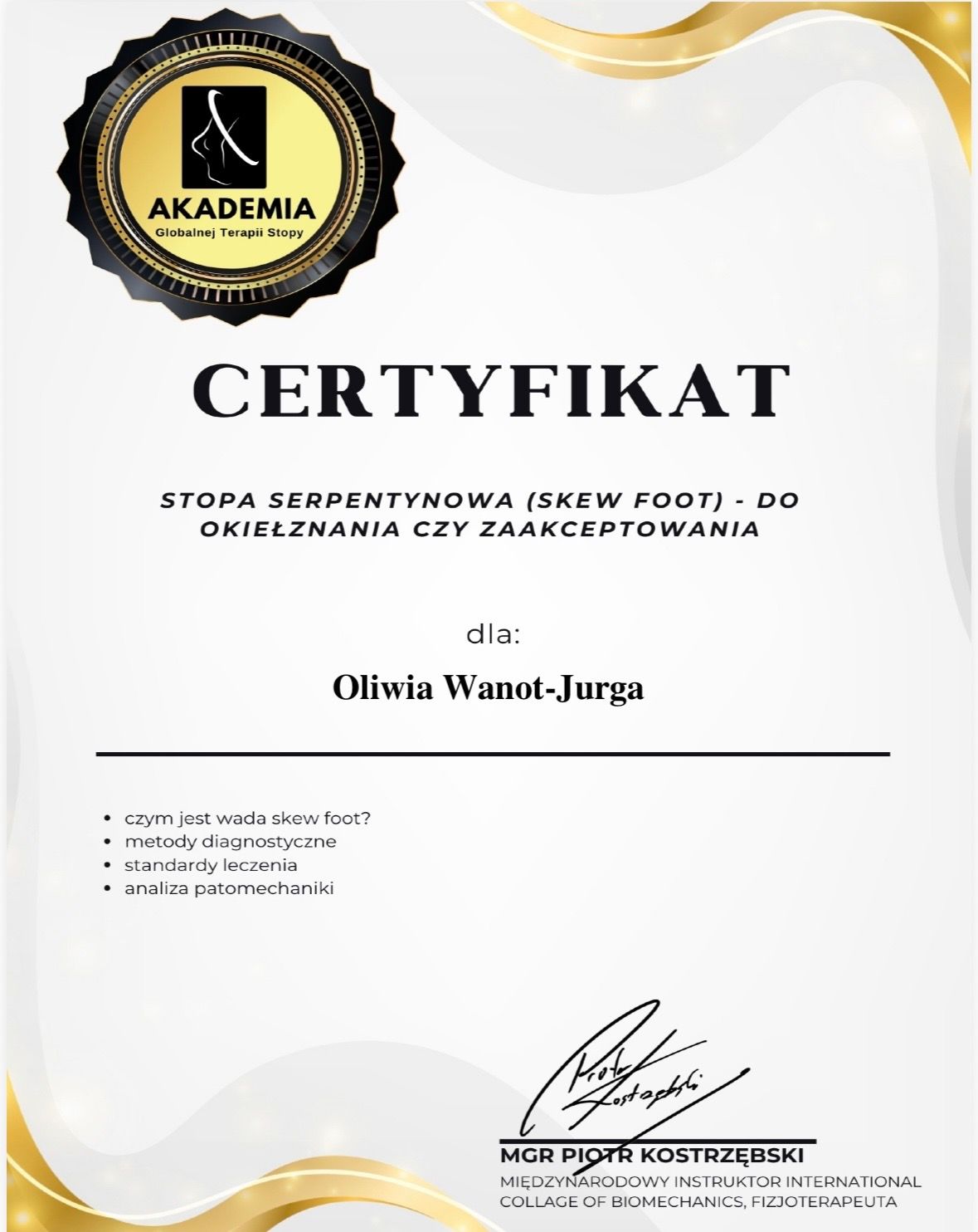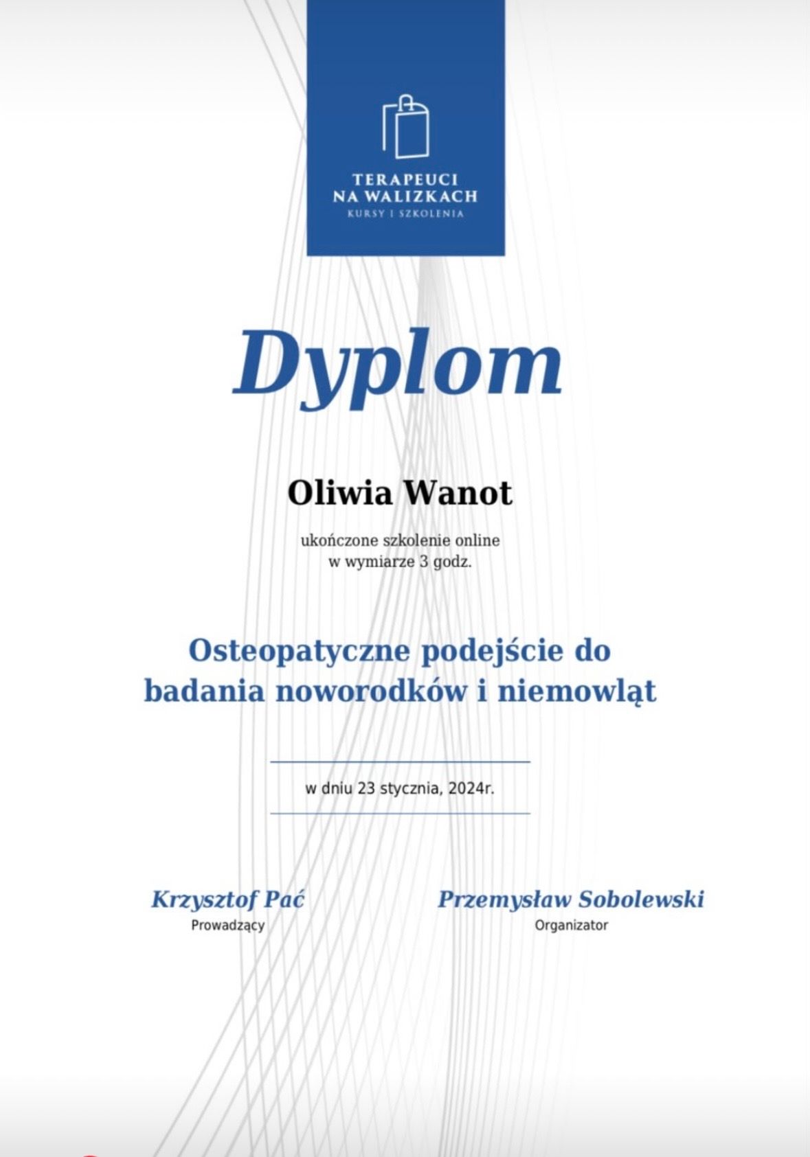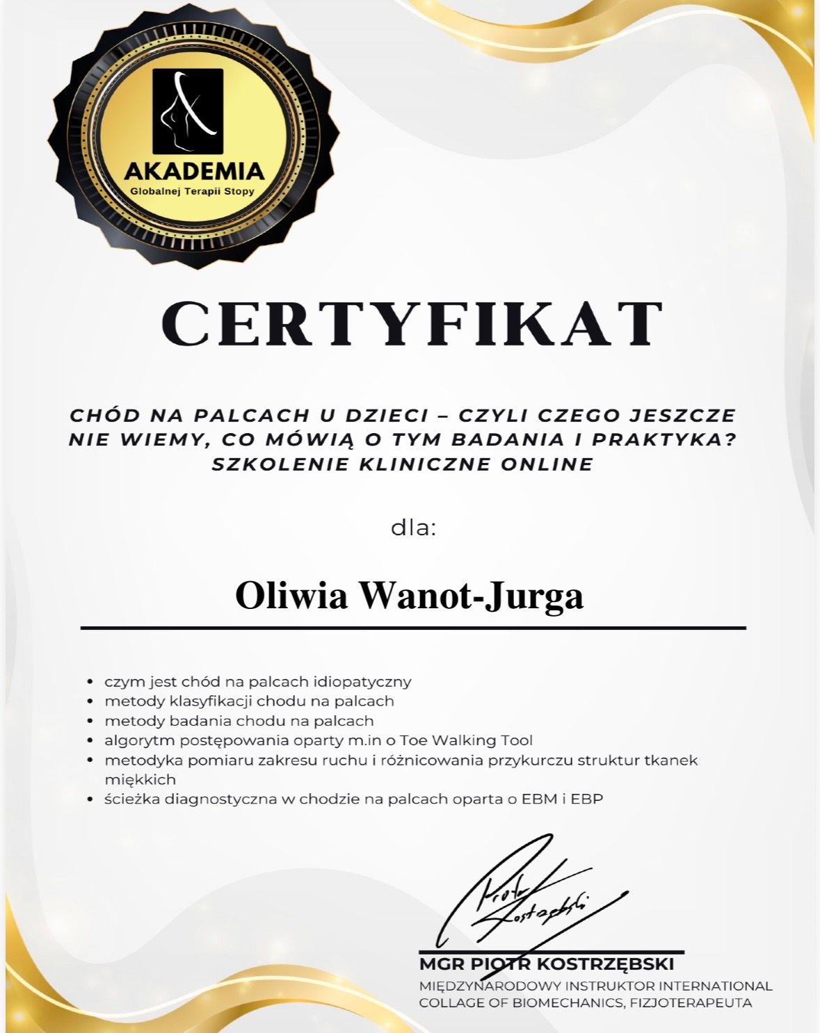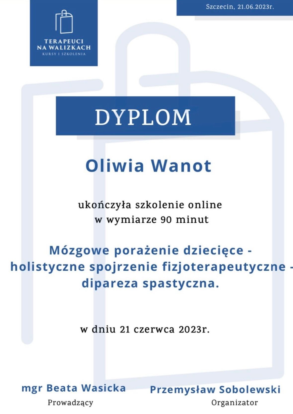 Nazywam się Oliwia Wanot - Jurga, jestem absolwentką Akademii Wychowania Fizycznego w Poznaniu gdzie uzyskałam tytuł magistra Fizjoterapii. Na codzień pracuje w gabinetach prywatnych na terenie Konina oraz prowadzę swój profil w social mediach. Jestem certyfikowanym terapeuta koncepcji Bobath i Bobath Baby, Trójpłaszczyznowej Manualnej Terapii Stóp, diagnostyki Prechtla, Monachijskiej Funkcjonalnej Diagnostyki Rozwojowej i już wkrótce terapeutą metody Vojty. Jestem rownież absolwentką licznych szkoleń z zakresu Fizjoterapii w Pediatrii, oczywiście w planach mam jeszcze kilkanaście szkoleń. Na codzień pracuje z wcześniakami i niemowlakami do 6 miesiąca. Głównymi problemami są: zaburzenia rozwoju ruchowego, asymetria ułożeniowa, kręcze szyjne, zniekształceniami w obrębie czaszki, zaburzenia aktywności mięśniowej,