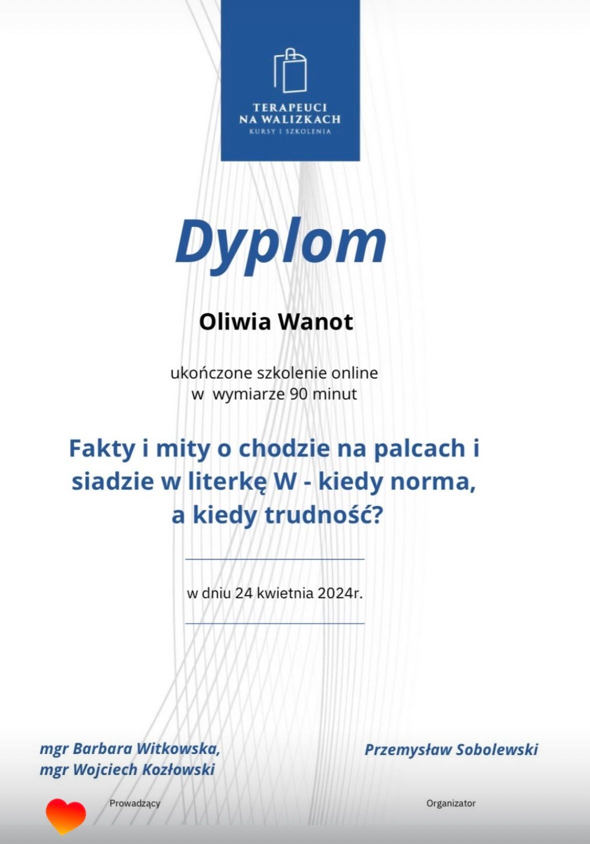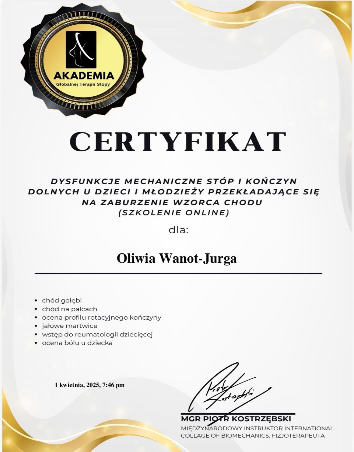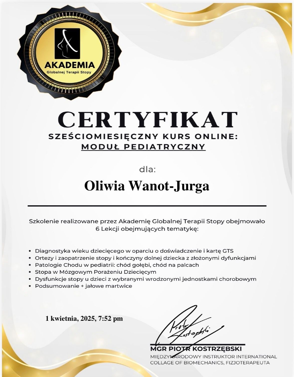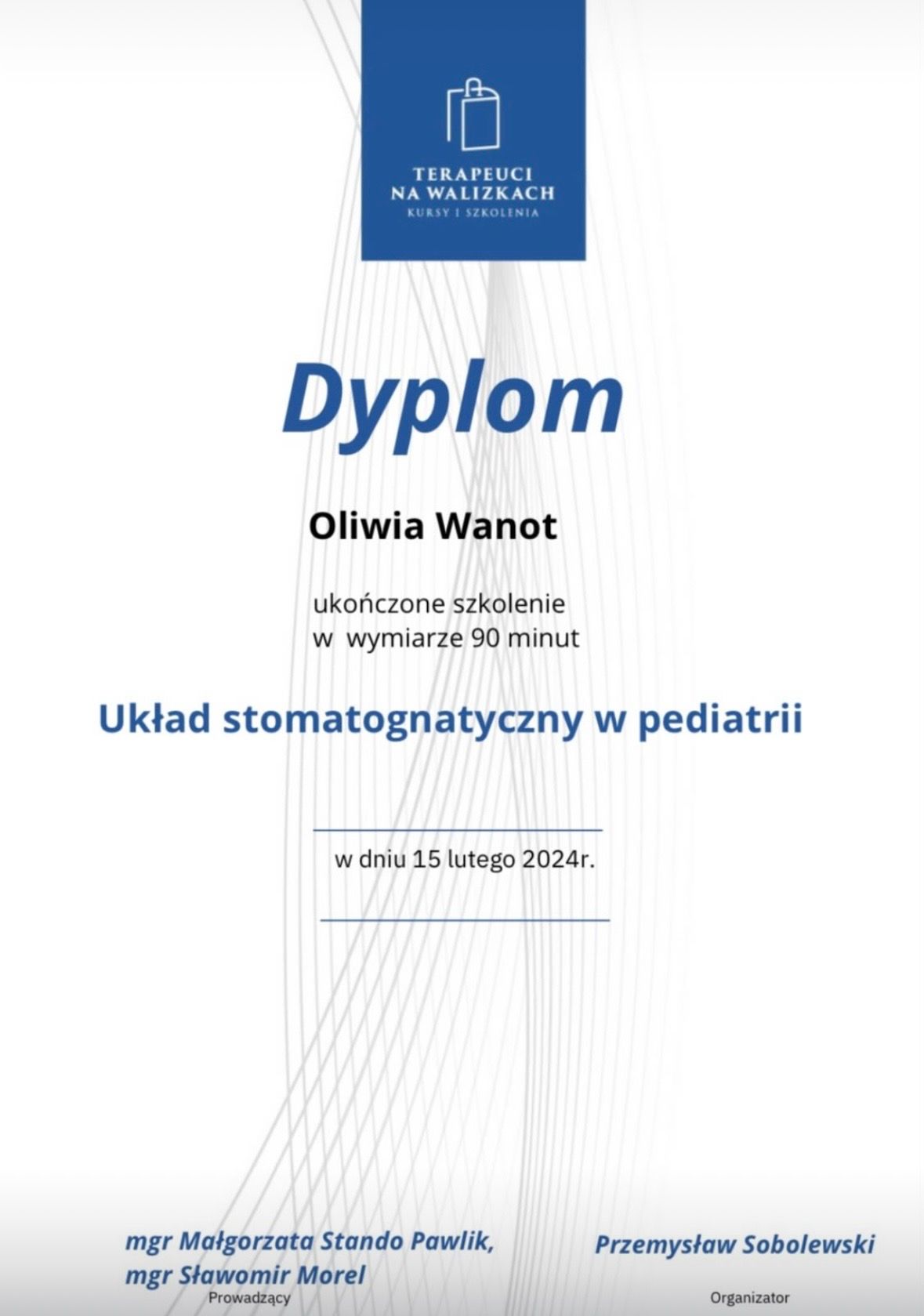 Nazywam się Oliwia Wanot - Jurga, jestem absolwentką Akademii Wychowania Fizycznego w Poznaniu gdzie uzyskałam tytuł magistra Fizjoterapii. Na codzień pracuje w gabinetach prywatnych na terenie Konina oraz prowadzę swój profil w social mediach. Jestem certyfikowanym terapeuta koncepcji Bobath i Bobath Baby, Trójpłaszczyznowej Manualnej Terapii Stóp, diagnostyki Prechtla, Monachijskiej Funkcjonalnej Diagnostyki Rozwojowej i już wkrótce terapeutą metody Vojty. Jestem rownież absolwentką licznych szkoleń z zakresu Fizjoterapii w Pediatrii, oczywiście w planach mam jeszcze kilkanaście szkoleń. Na codzień pracuje z wcześniakami i niemowlakami do 6 miesiąca. Głównymi problemami są: zaburzenia rozwoju ruchowego, asymetria ułożeniowa, kręcze szyjne, zniekształceniami w obrębie czaszki, zaburzenia aktywności mięśniowej,