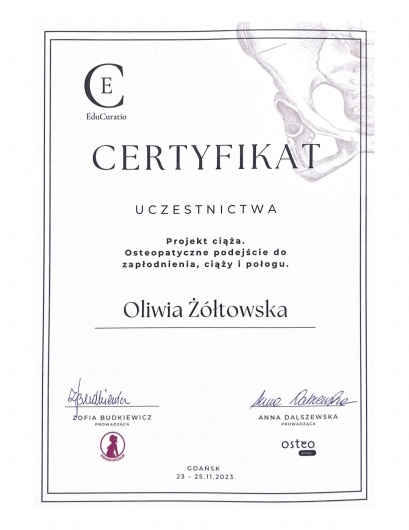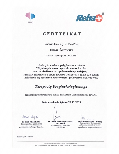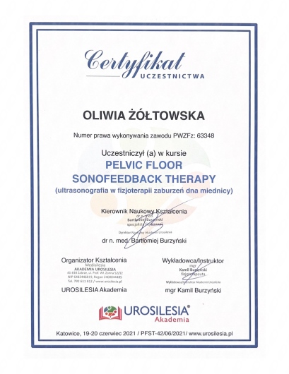 Jaki jest zakres porad oferowanych przez Oliwia Żółtowska?Oliwia Żółtowska to fizjoterapeuta. Na podstawie swojego doświadczenia i wykształcenia Oliwia Żółtowska oferuje usługi takie jak: diagnostyka i terapia mięśni dna miednicy, Konsultacja uroginekologiczna (pierwsza wizyta), fizjoterapia kobiet w ciąży / fizjoterapia okołoporodowa (pierwsza wizyta), fizjoterapia kobiet w ciąży / fizjoterapia okołoporodowa (kolejna wizyta), fizjoterapia uroginekologiczna (kolejna wizyta), fizjoterapia uroginekologiczna, fizjoterapia przed- i pooperacyjna, terapia blizny po cesarskim cięciu, ćwiczenia indywidualne pacjentek po mastektomii, konsultacja fizjoterapeutyczna (kolejna wizyta).