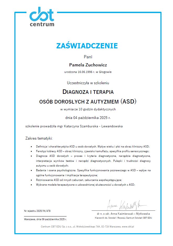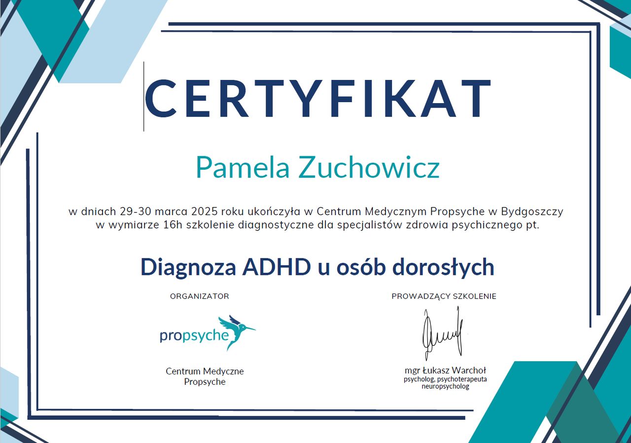 I also specialize in ADHD diagnosis for adults, helping to understand how this disorder, often undiagnosed in childhood, can impact daily life. I approach the diagnosis in a comprehensive manner, using reliable methods such as the DIVA 5.0 interview and analysis of the patient's history, which allows for the effective development of support strategies. I believe that awareness of one's difficulties is the first step toward a better life. I support my patients in building self-acceptance and coping with the challenges posed by everyday life. If you have questions about ADHD, emotions, or life challenges – I am here to help.