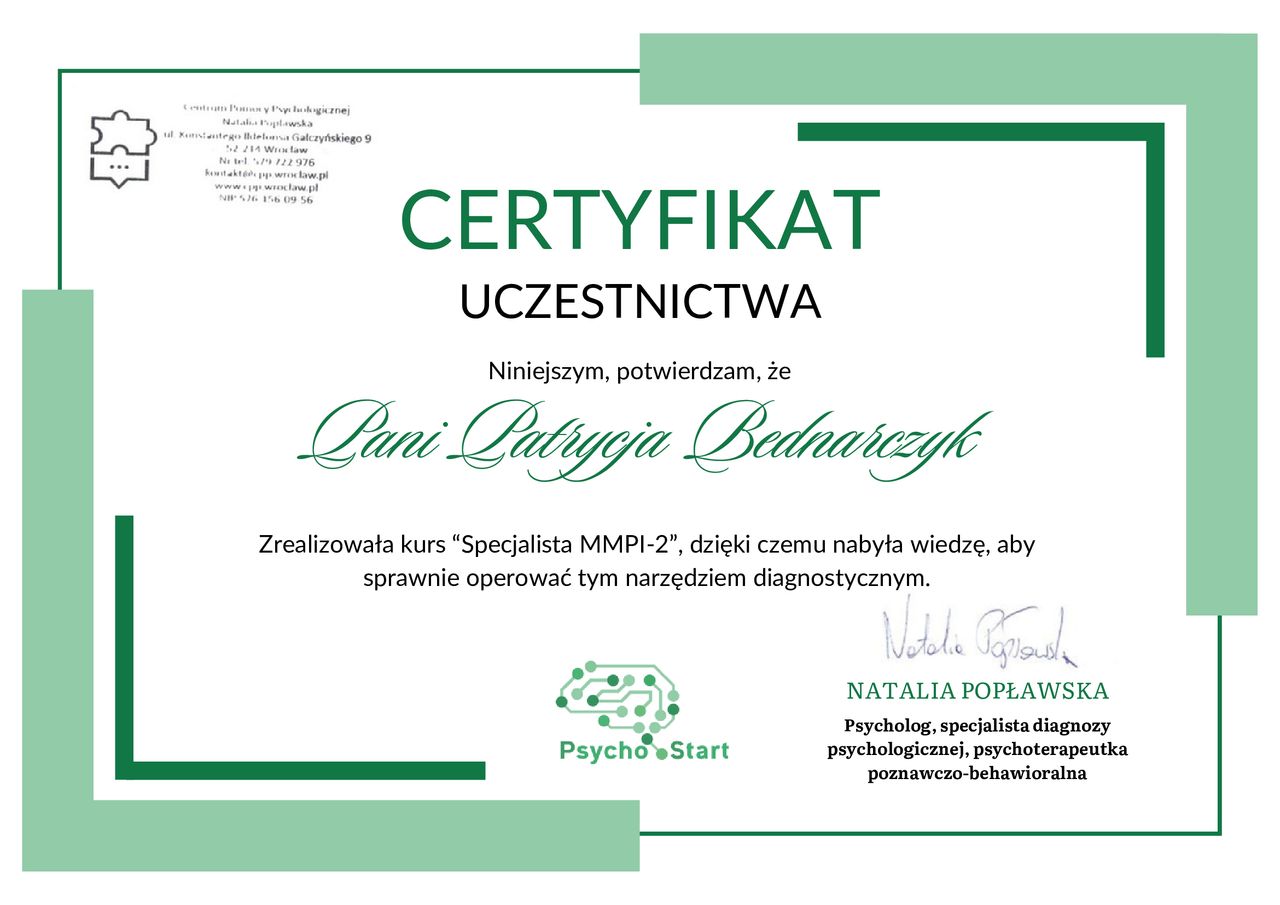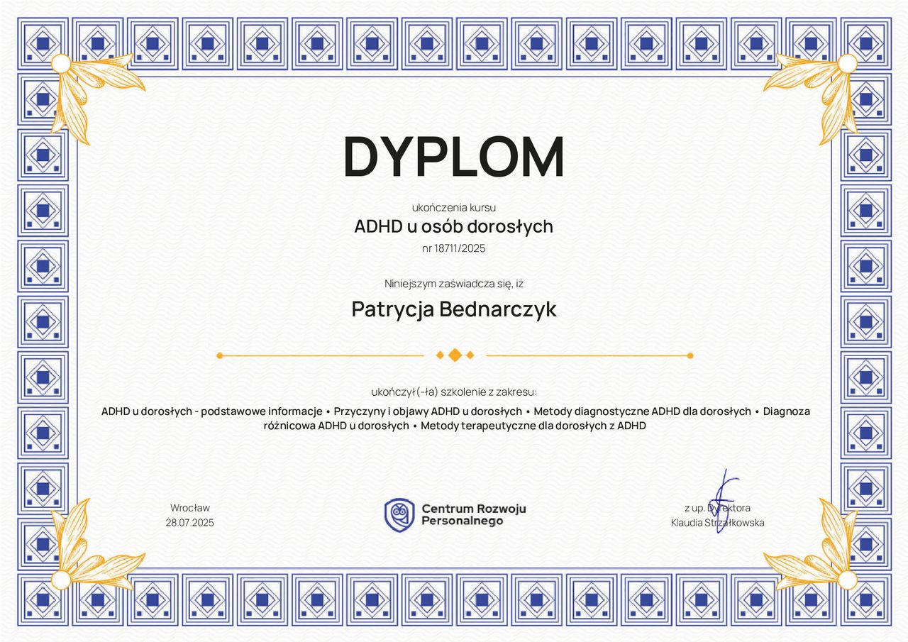 Jestem psychologiem i diagnostą psychologicznym. Ukończyłam studia na Uniwersytecie Gdańskim, a swoją wiedzę rozwijałam podczas licznych praktyk i szkoleń. Psychologia to moja pasja i sposób, w jaki mogę wspierać innych w lepszym zrozumieniu siebie oraz codziennych trudności.